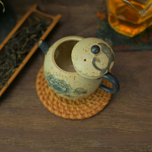 Old Clay Blue-and-White Volcanic Stone Style Caramel Glaze Teapot with Hand-Painted Peony Design