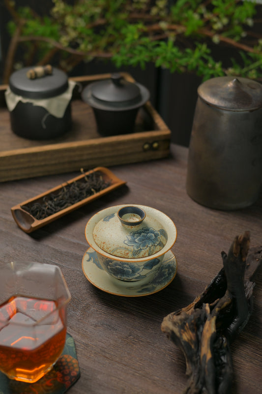 Old Clay Blue-and-White Volcanic Stone Style Caramel Glaze Gaiwan with Hand-Painted Peony Design
