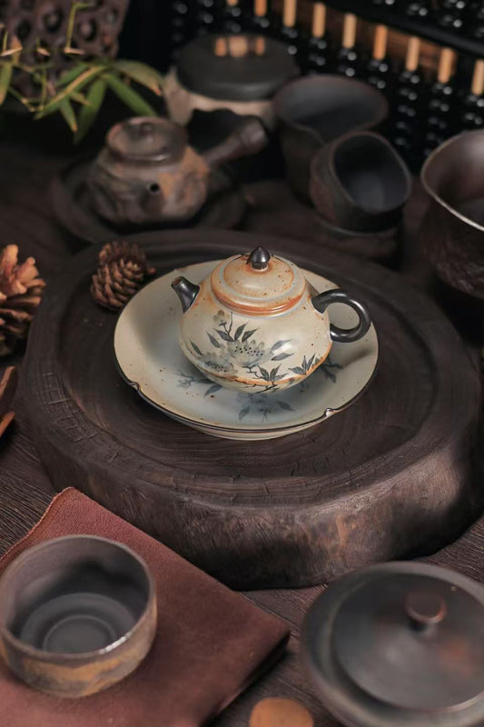 Small-Size Retro Hand-Painted Peony Teapot with Drip Tray
