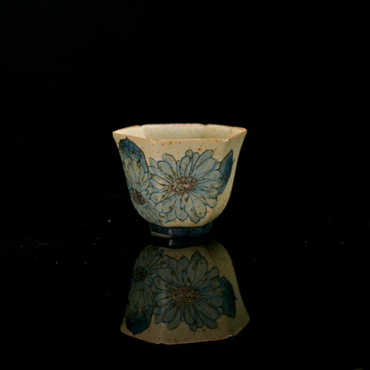 Old Clay Blue-and-White Volcanic Stone Caramel Glaze Tea Cup (45ml) with Hand-Painted Flora Design