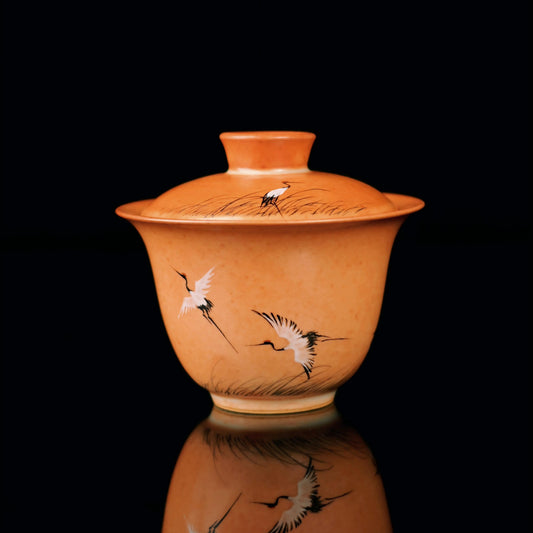 Shino Ware Hand-Painted Crane Gaiwan Set