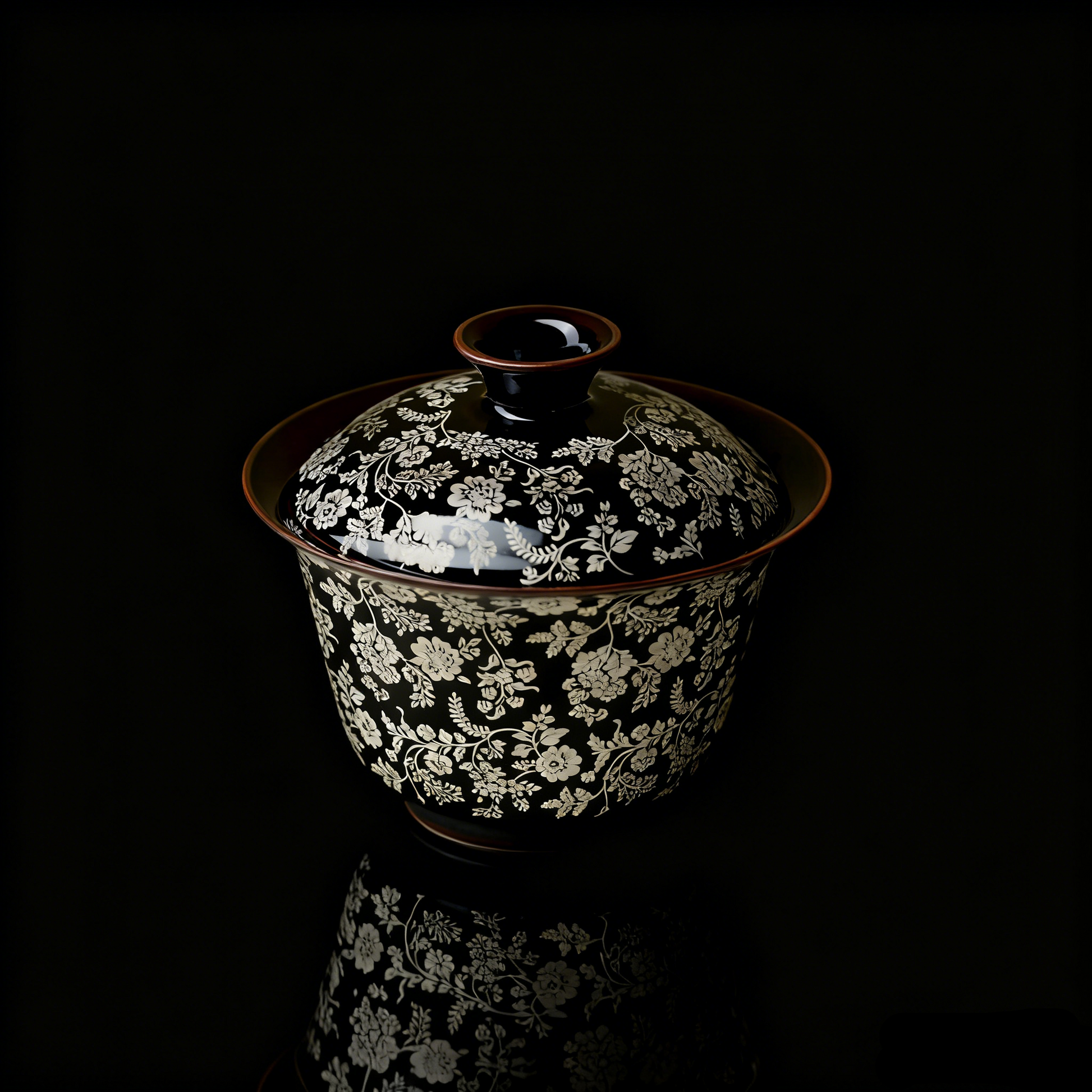 Black-Glazed Gaiwan with Silver-Painted Hundred Flowers