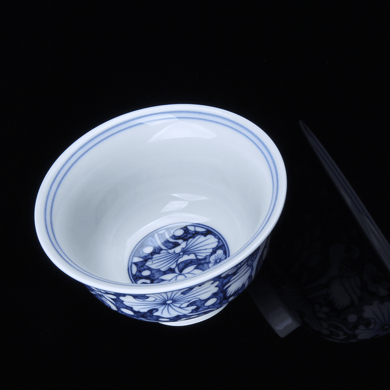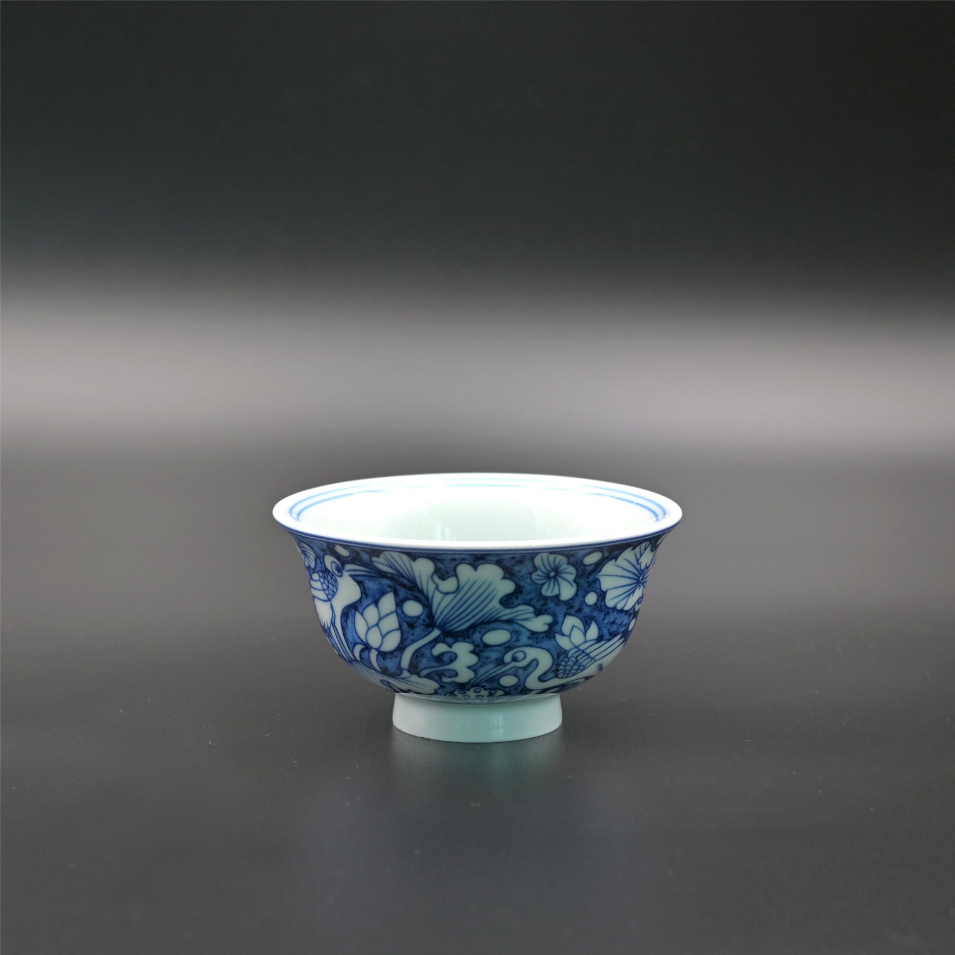 The phrase "Blue and White Porcelain Host's Teacup with Lotus Pond and Egret Design" refers to a teacup that utilizes the decorative technique of blue and white porcelain, featuring a design of a lotus pond with egrets. Blue and white porcelain is a traditional Chinese ceramic decoration method, where cobalt-blue pigments are used to paint patterns on the porcelain, which is then covered with a clear glaze and fired at high temperatures to produce blue floral designs. "Negative Space Technique." (leaving white space) refers to the intentional blank areas in the design, which contrast with the patterns to enhance artistic effect. The “lotus pond with egrets” depicts a lotus pond and egrets resting in it, a common theme in traditional Chinese art that symbolizes elegance and tranquility. The term “host's teacup” indicates that this teacup is specifically designed for use by the host in a tea room or by the owner, possibly carrying special meaning or status.