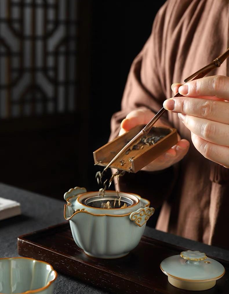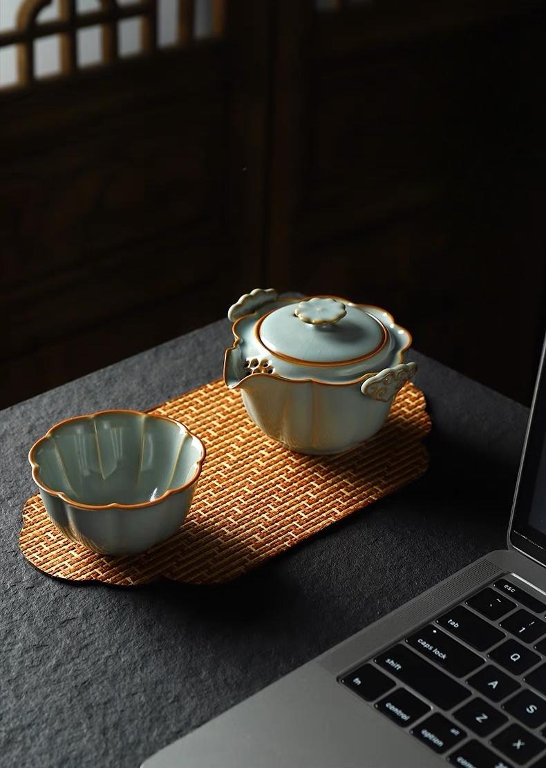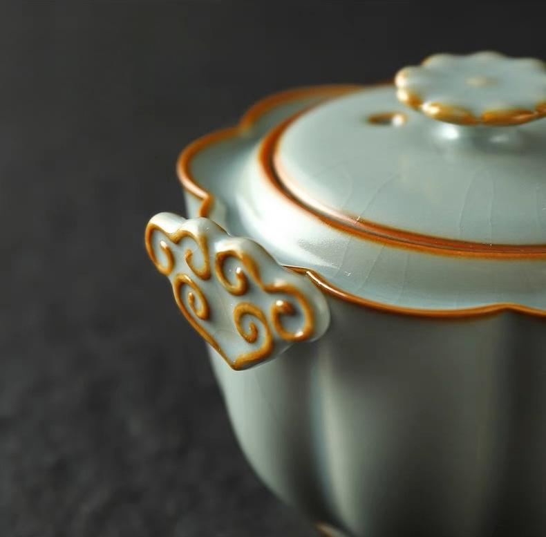 The teapot and cup are made with an ash-glazed body, with a celadon blue color that has a slight gray hue, showcasing another form of elegance characteristic of Ru ware.