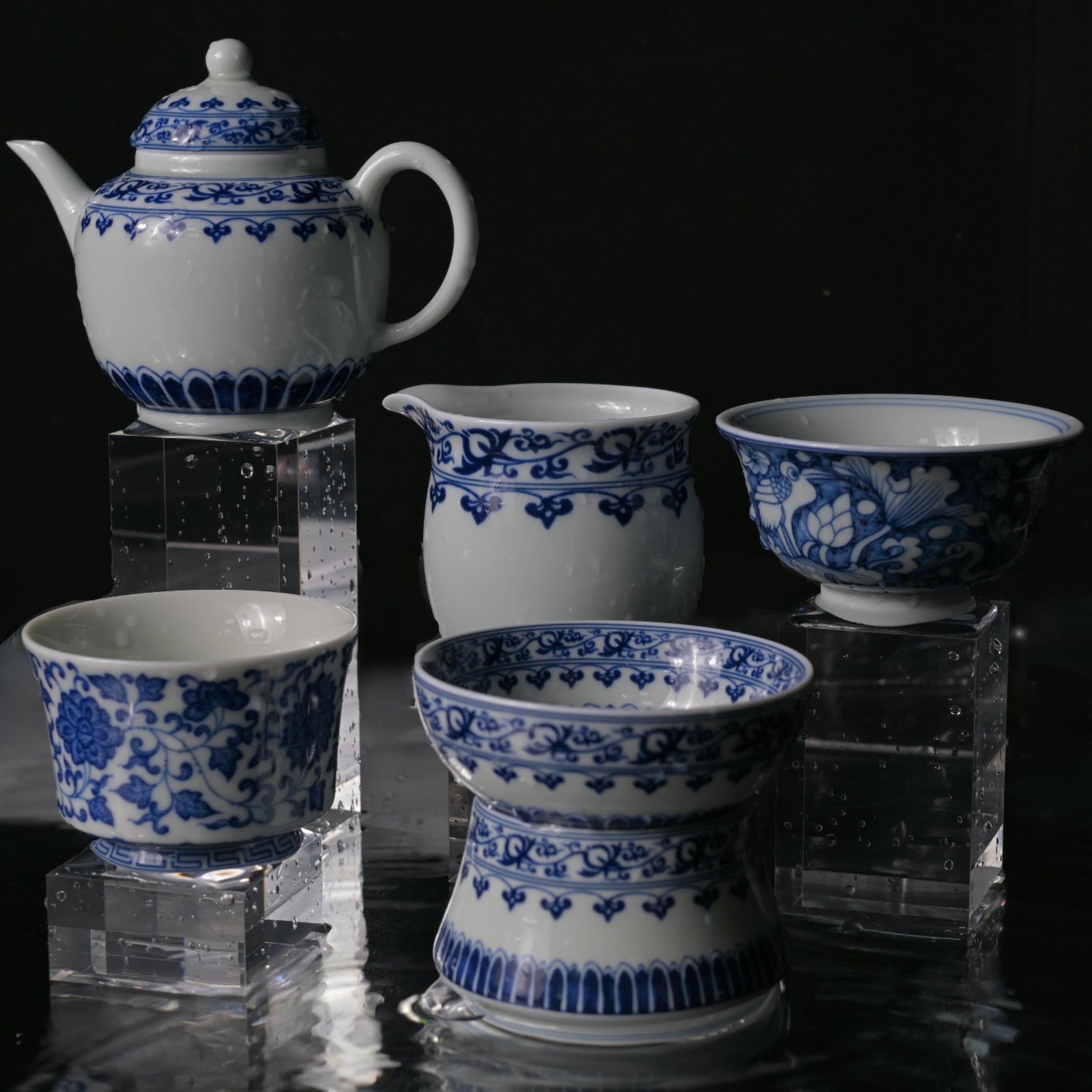 The lotus scrolling pattern is one of the traditional decorative designs of ancient China. It became widely popular after the Yuan Dynasty and is one of the most common motifs on porcelain. During the Ming Dynasty, it was sometimes referred to as "twisting branches," using plant stems or vines as a framework that extends in all directions, forming continuous wave-like patterns either two-dimensionally or four-dimensionally. This design is cyclic, endlessly varying, and dynamic. The vine pattern is a stylized, refined version of creeping plants, giving it an elegant and lively appearance. Alongside other motifs like the lotus petal pattern, cloud scroll pattern, ruyi pattern, and key-fret pattern, the vine pattern is a key decorative element in ancient Chinese art and is widely used in Chinese ceramic tea wares.