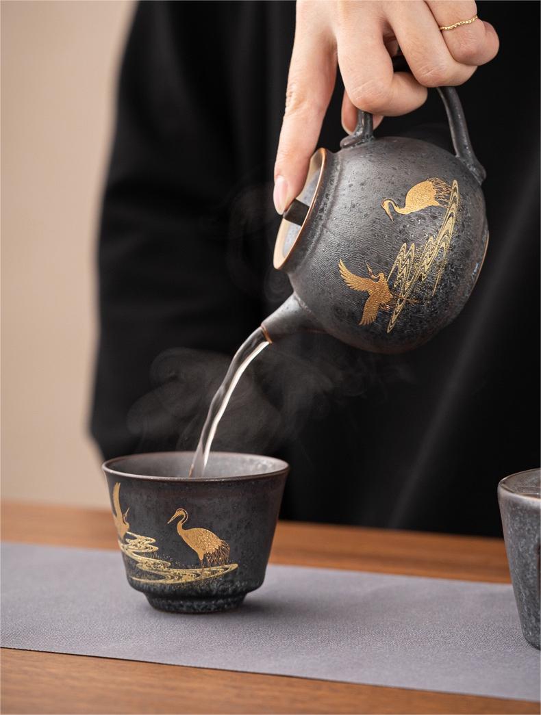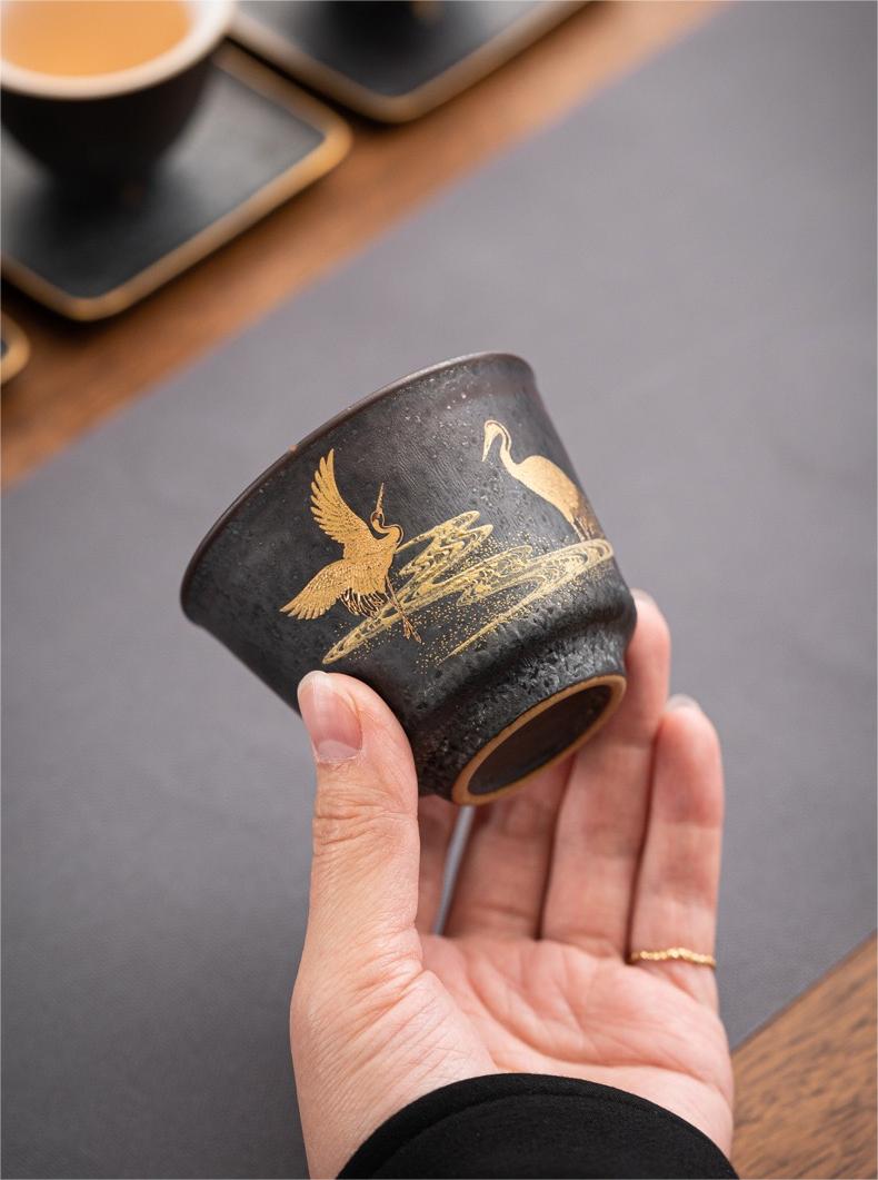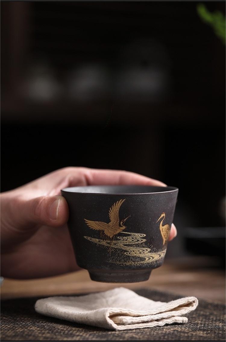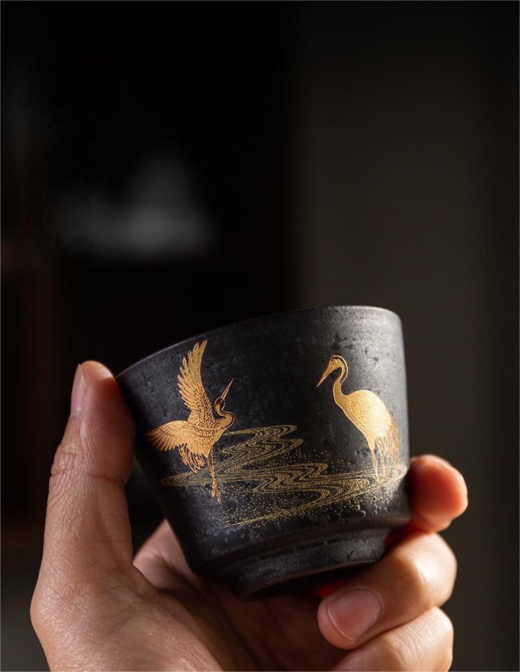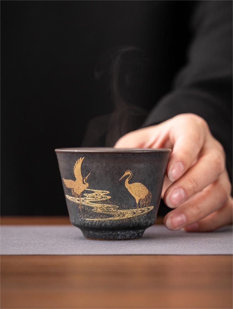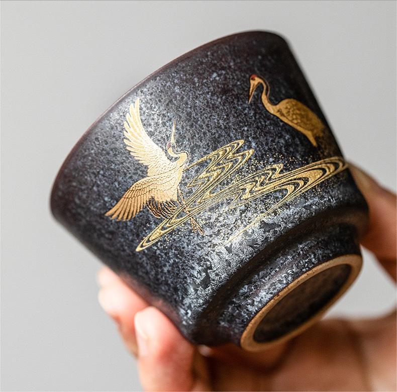 Jingdezhen Handcrafted Vintage Ceramic Teacup with Gilded-paint Double Cranes