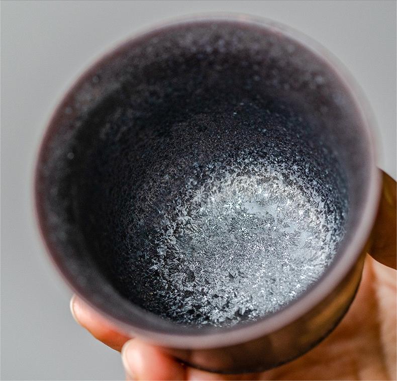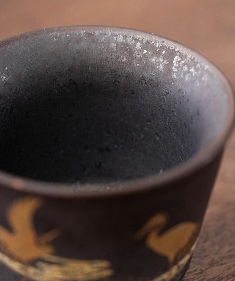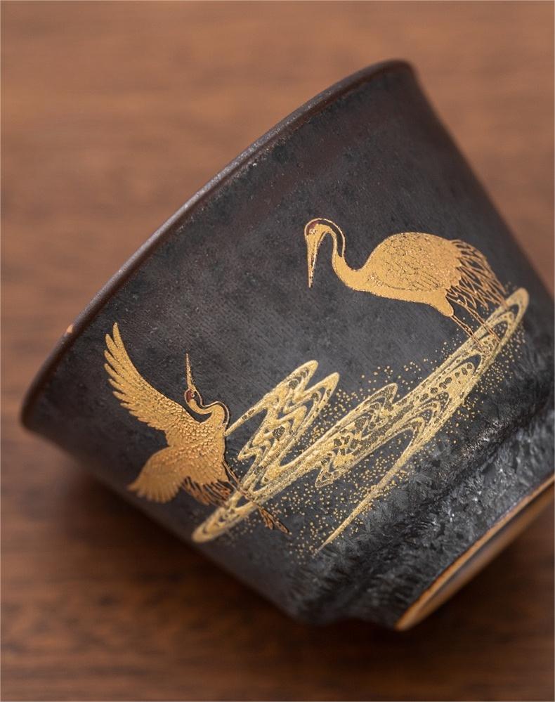 This Kung Fu teacup is made from coarse pottery, featuring a matte texture on the surface and hand-painted double cranes. It highlights the teacup's simplicity and elegance.