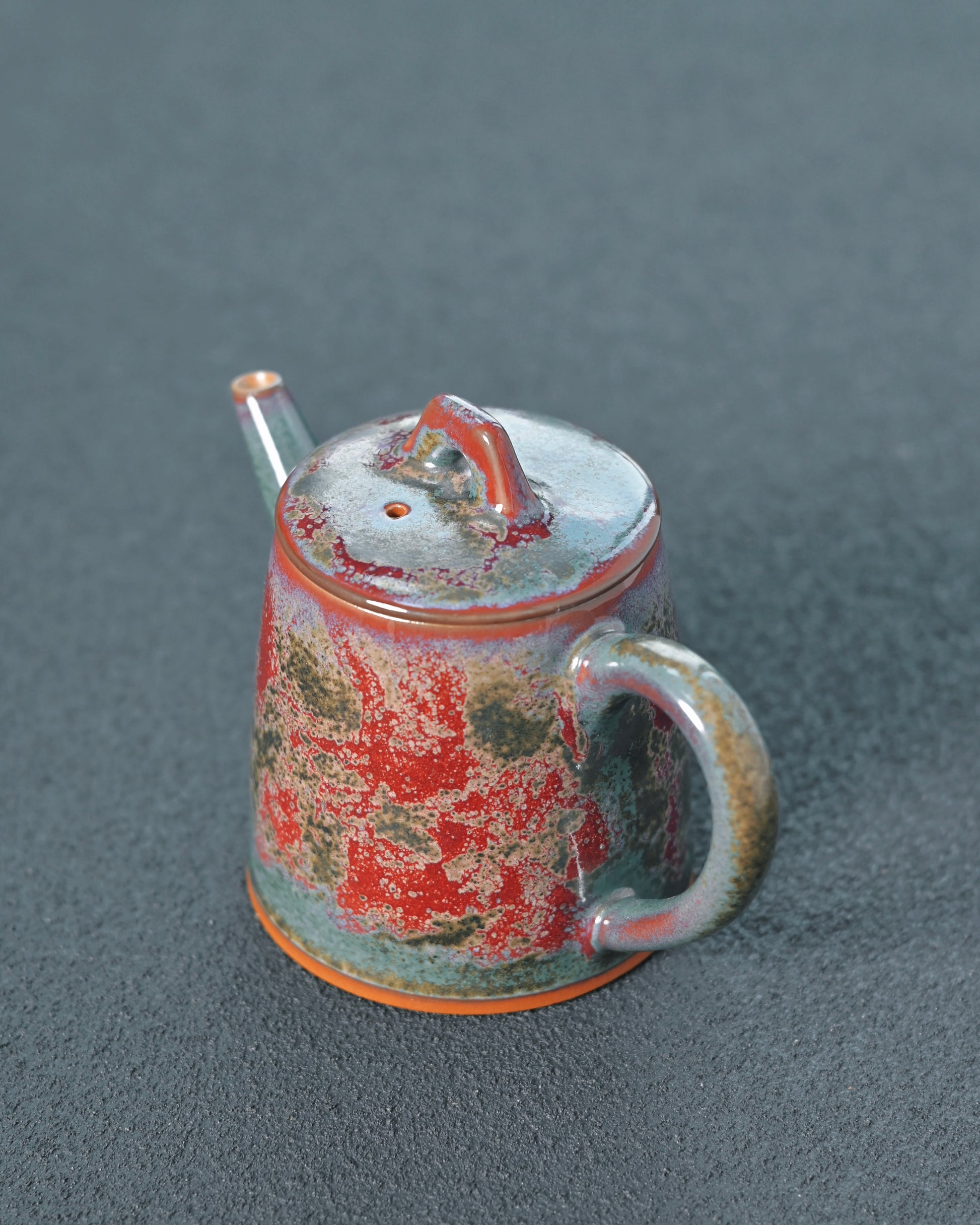 Across its body, purple flows like sunset melting into glaze, red resembles molten gold traversing jade, and blue spills like an inverted galaxy. This is not applied pigmentation but the kiln's breath at 1300°C, the natural movement of copper and iron minerals at extreme heat. Every drift of glaze is decided by the fire, beyond human control—just as no two clouds are alike, no two Jun teapots are identical.