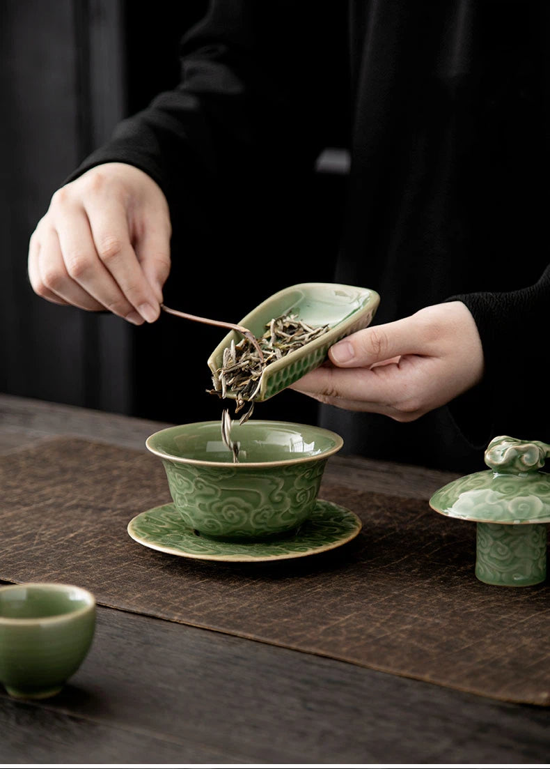This Longquan celadon gaiwan features an exquisite relief of cloud motifs, which in traditional Chinese culture symbolize harmony, blessings, and good fortune. It is finished with Longquan’s signature plum-green jade glaze—smooth, translucent, and softly lustrous under natural light.