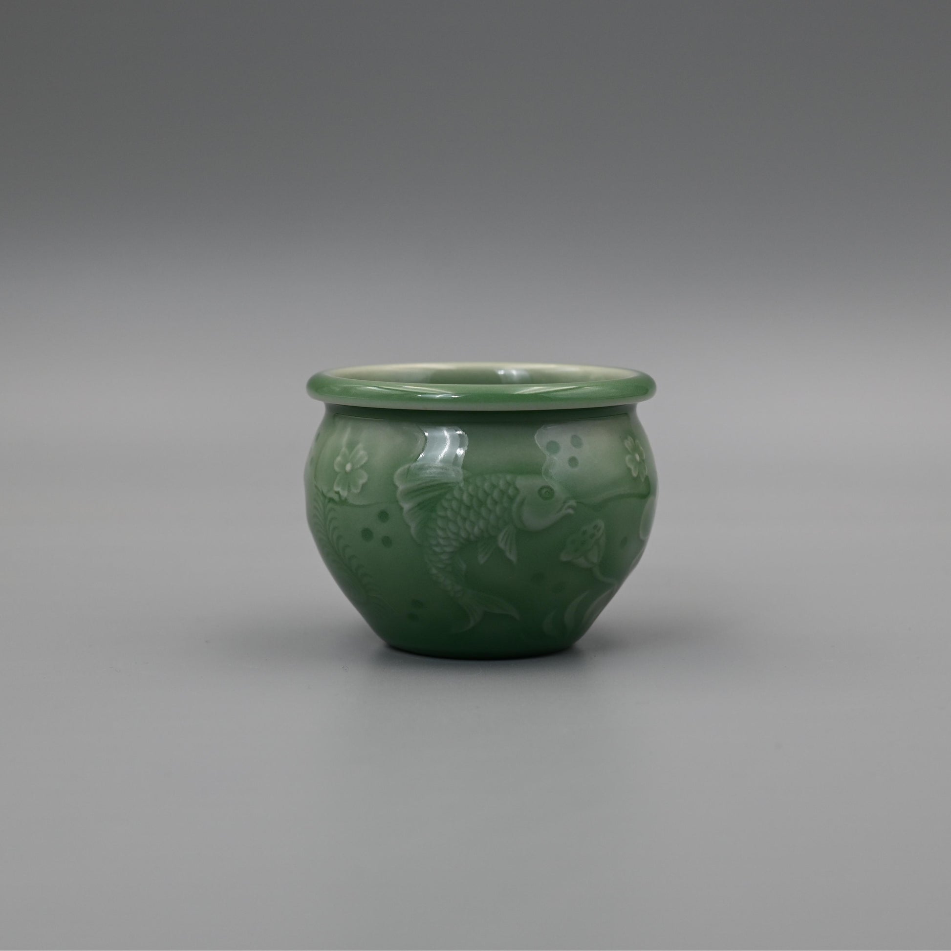 Longquan Celadon Plum Green Hand-Carved Fish and Algae Pattern Host Tea Cup