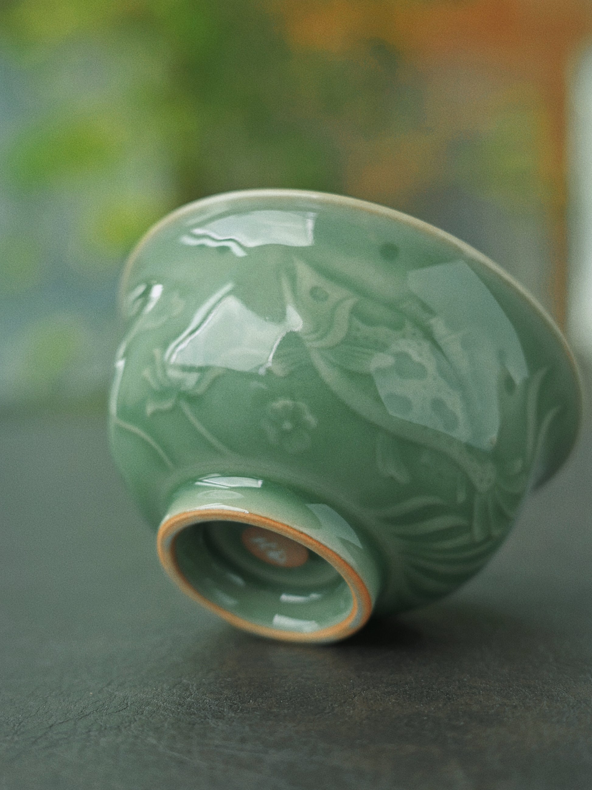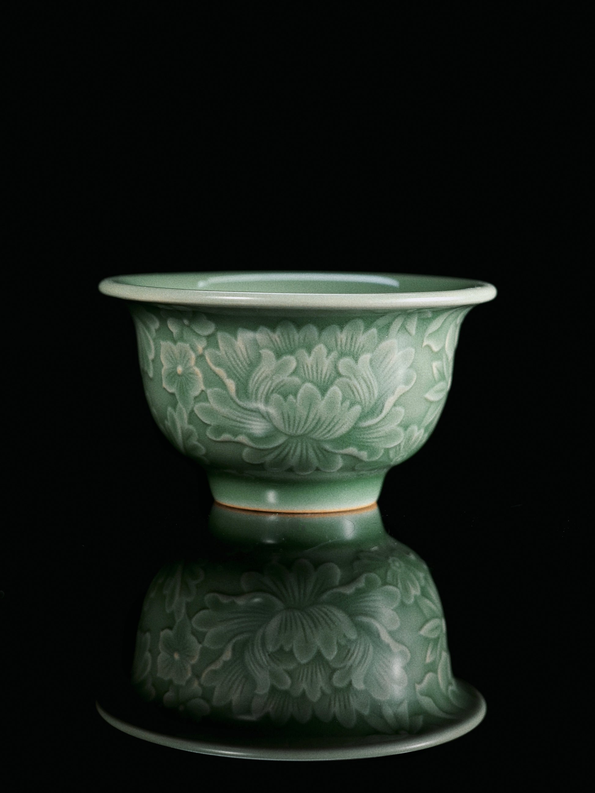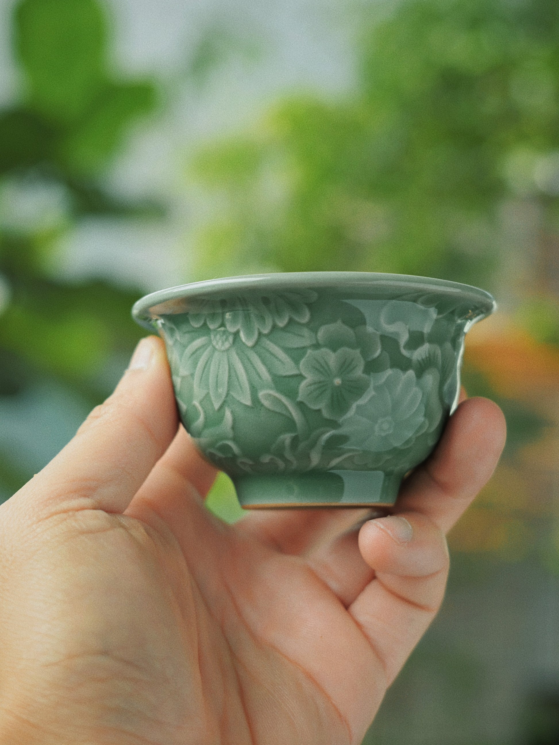 Longquan Celadon Plum-Green Relief-Carved Flowers Press Hand Teacup