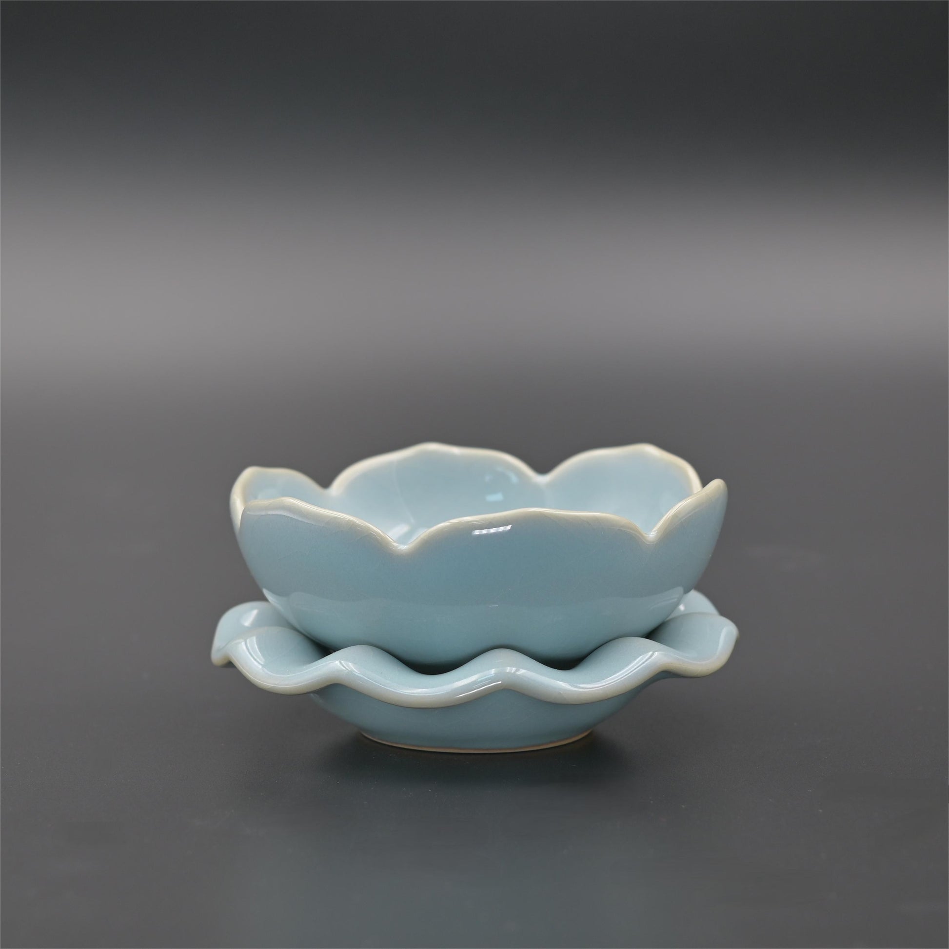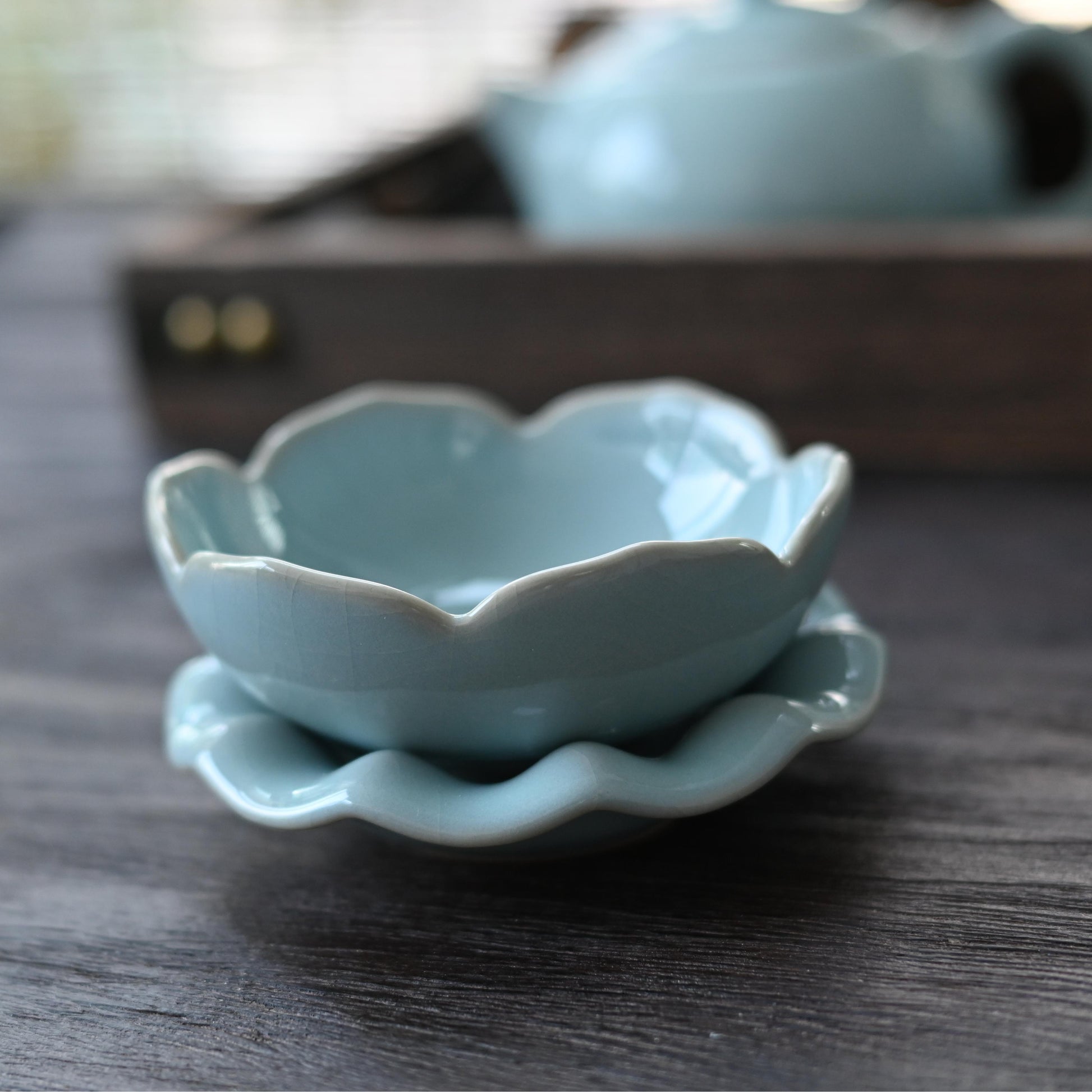 A tea filter is a device used to filter tea leaves from tea liquor. During tea brewing, it can be placed on the mouth of the teapot or cup to prevent tea leaves from entering the tea water, ensuring the clarity and flavor of the tea. The tea filter is made of Ru porcelain, with a classic sky-blue color, adding a decorative touch to the tea art.