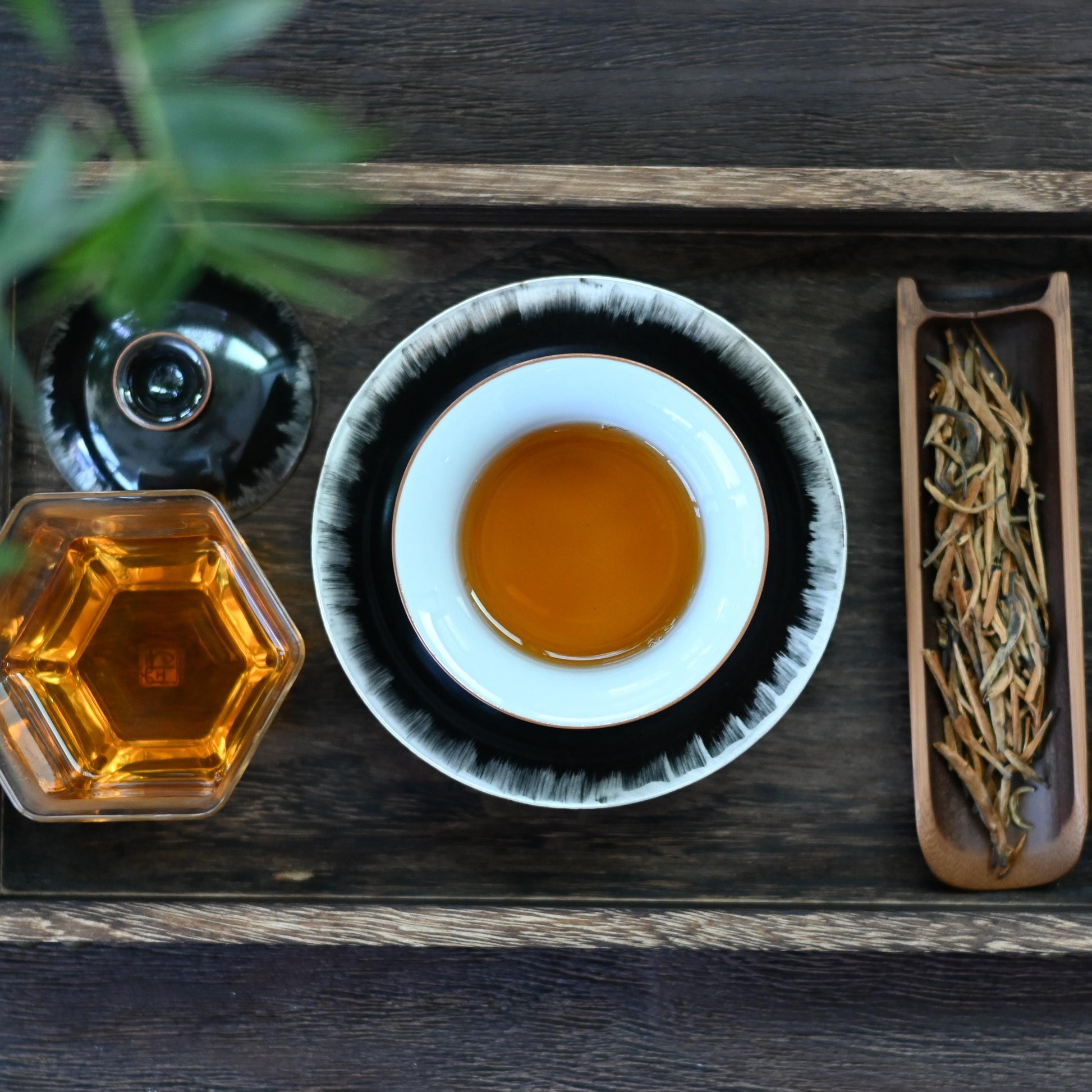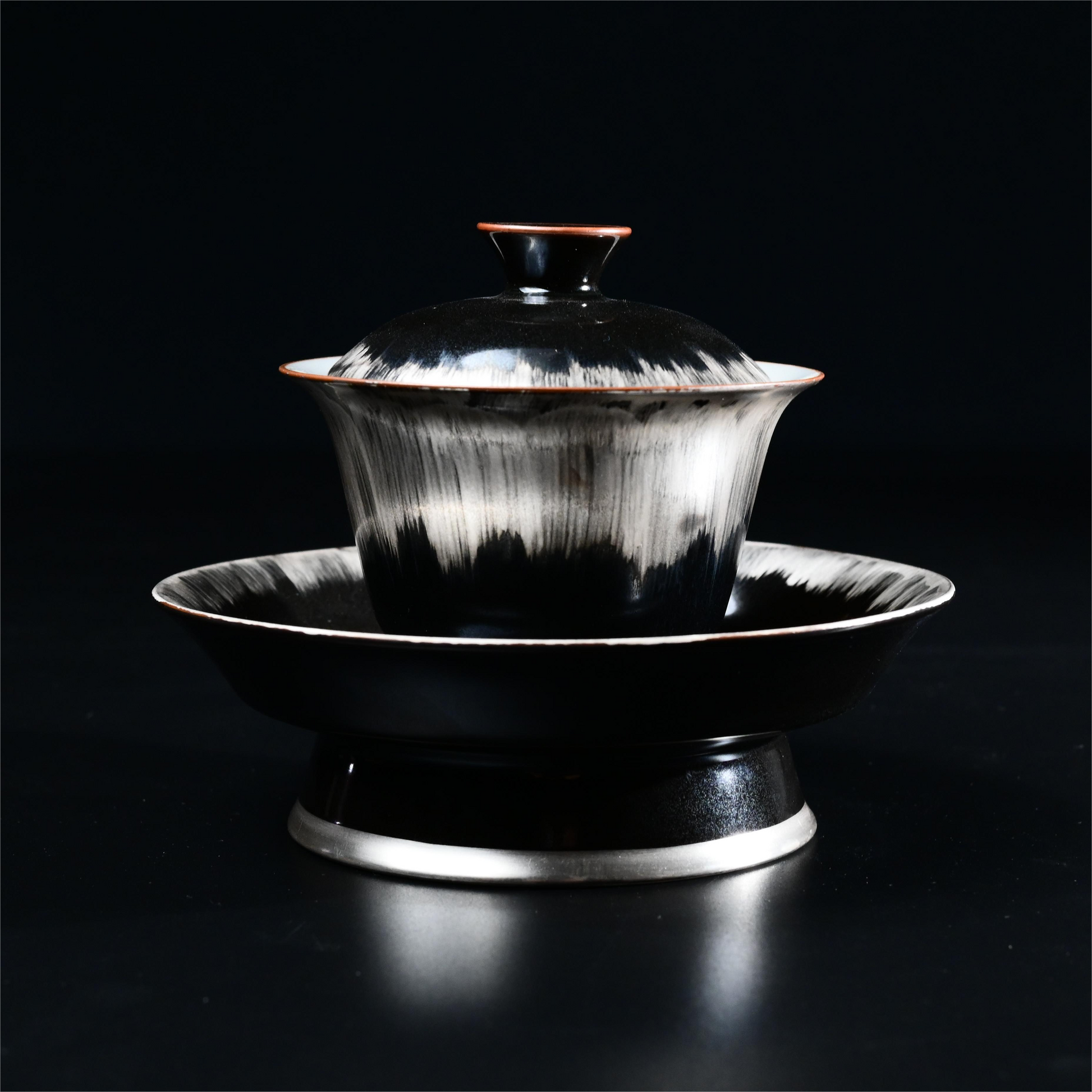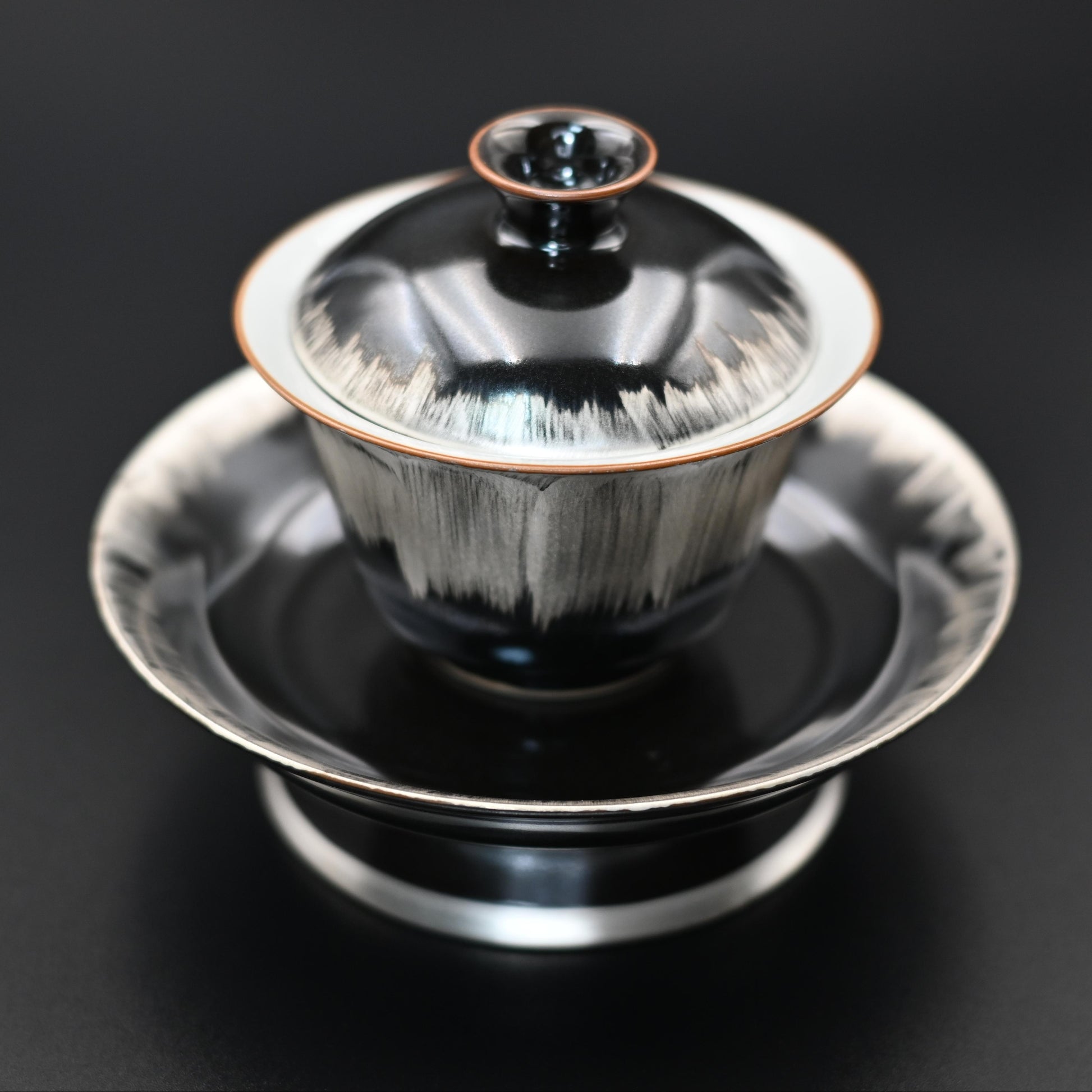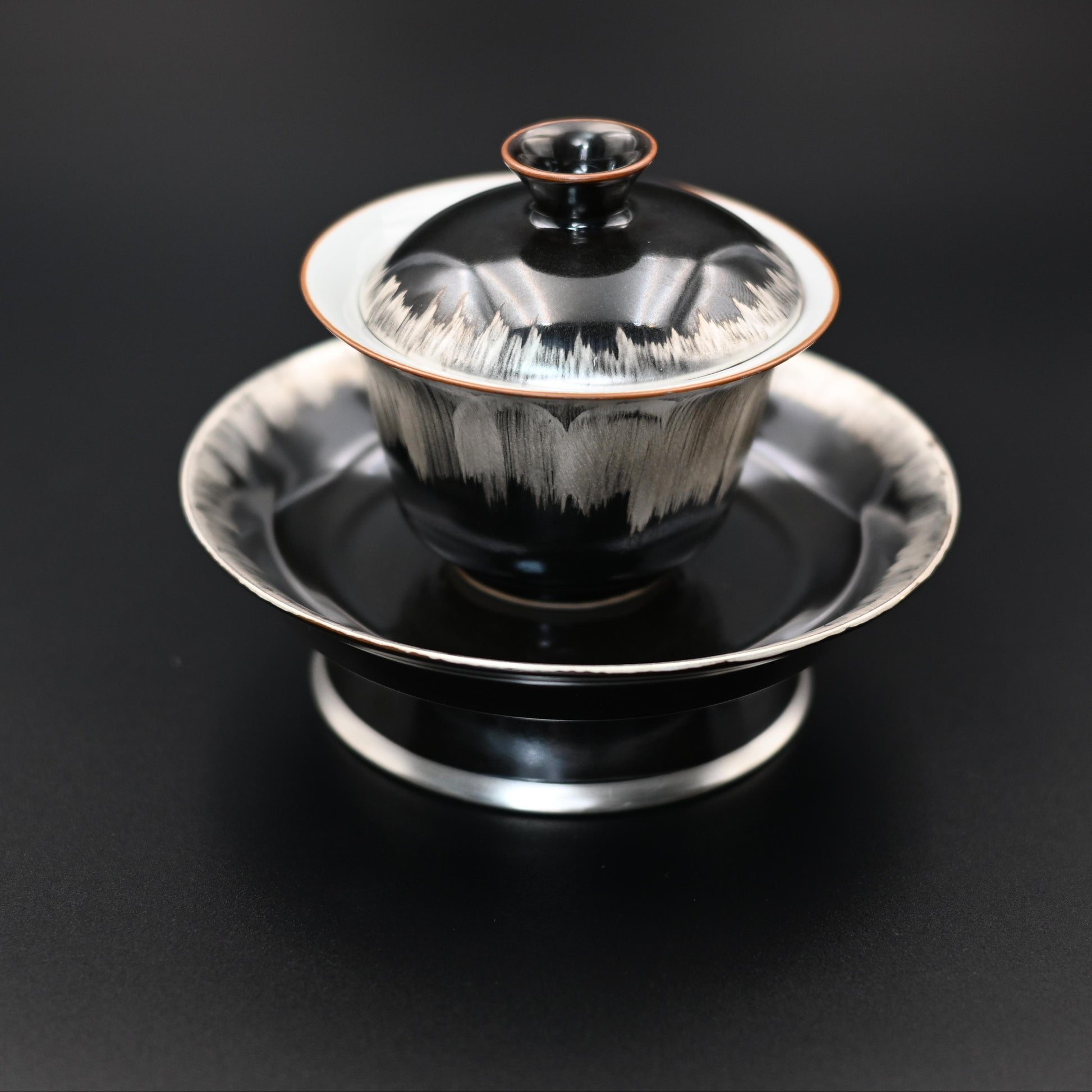A black and white silver-glazed gaiwan, inspired by the theme "Light in the Dark." Made with porcelain as the base and decorated with silver glaze, it features a striking black-and-white contrast crafted by skilled artisans. The gaiwan comes with a large saucer, adding an extra touch of elegance and stability.