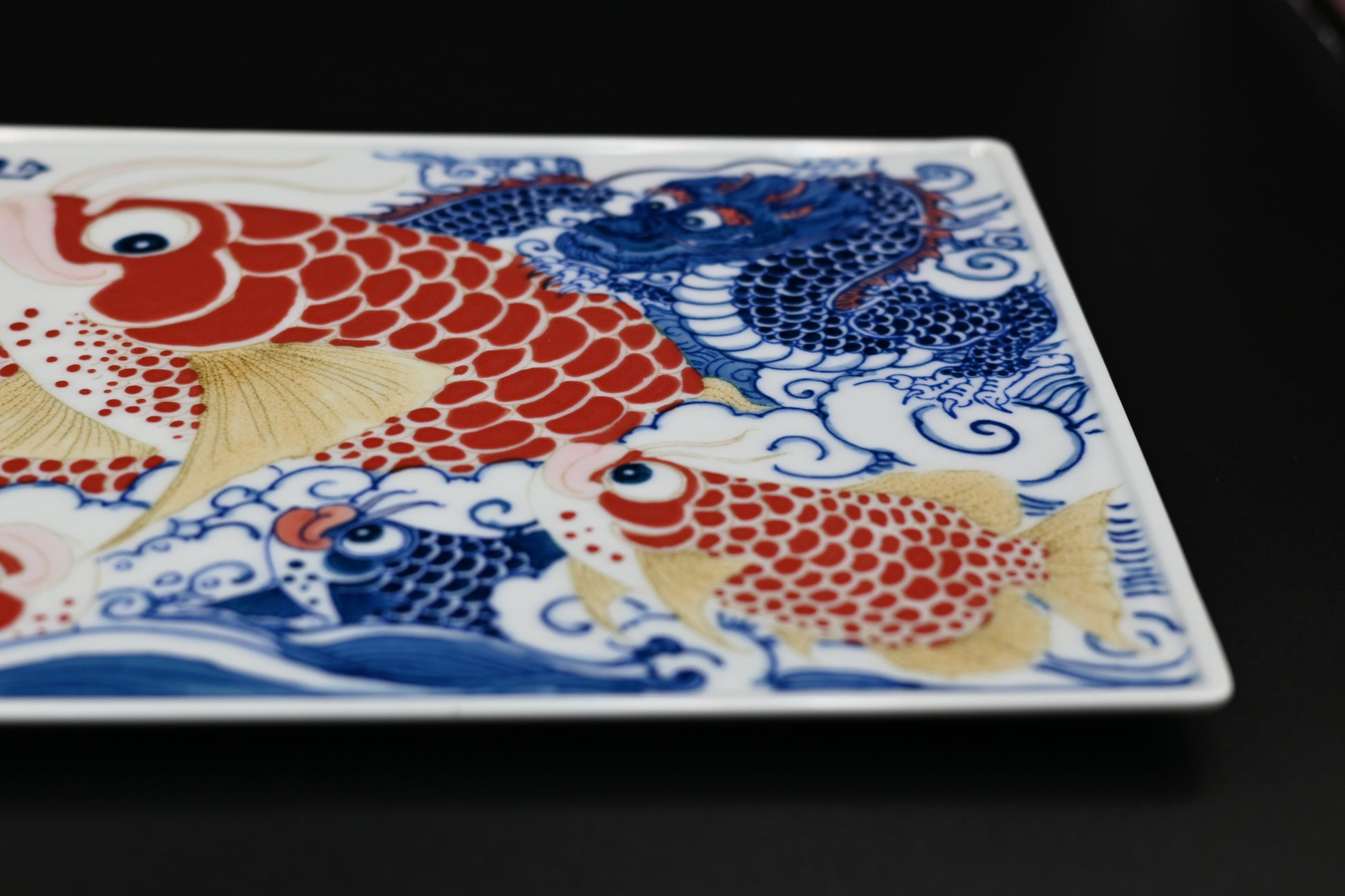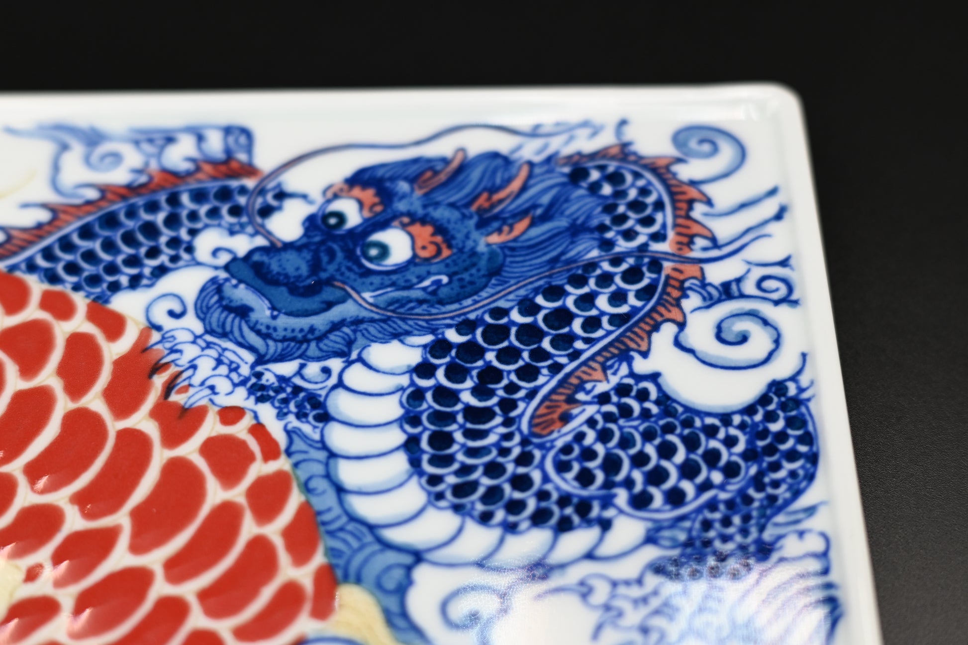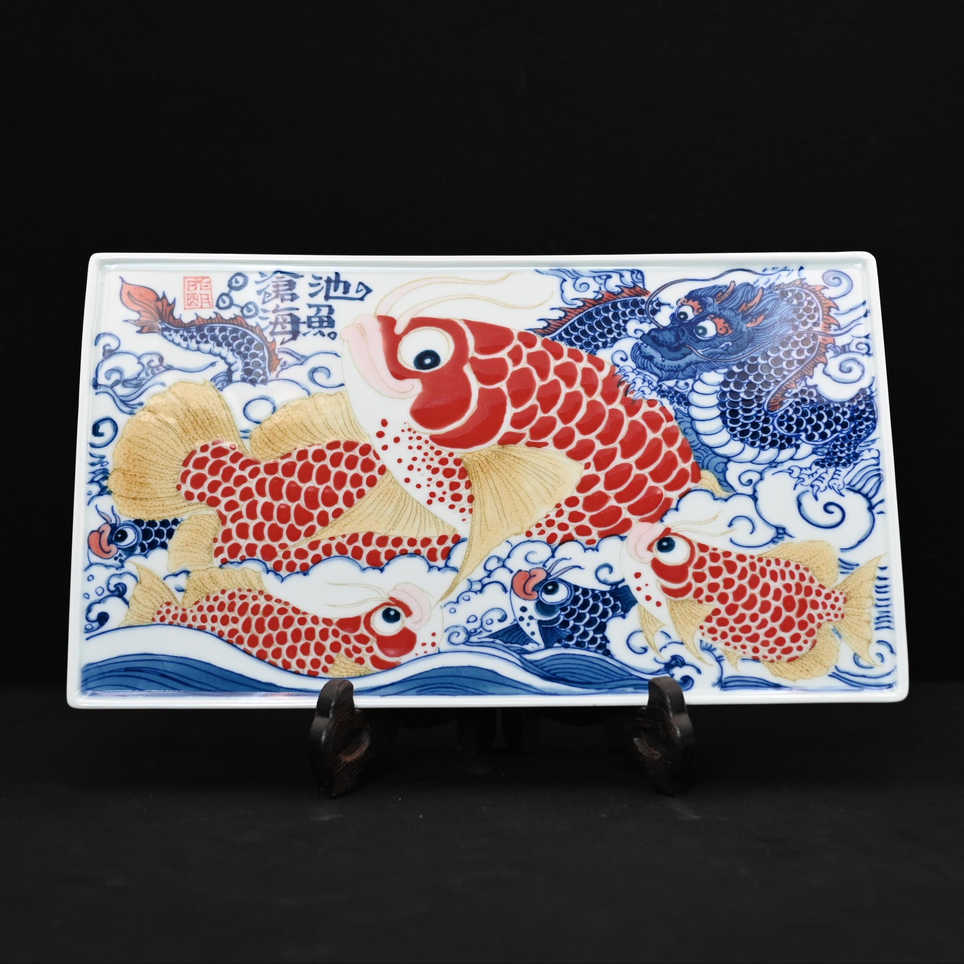 Underglaze Polychrome Dragon and Fish Dry Tea Tray