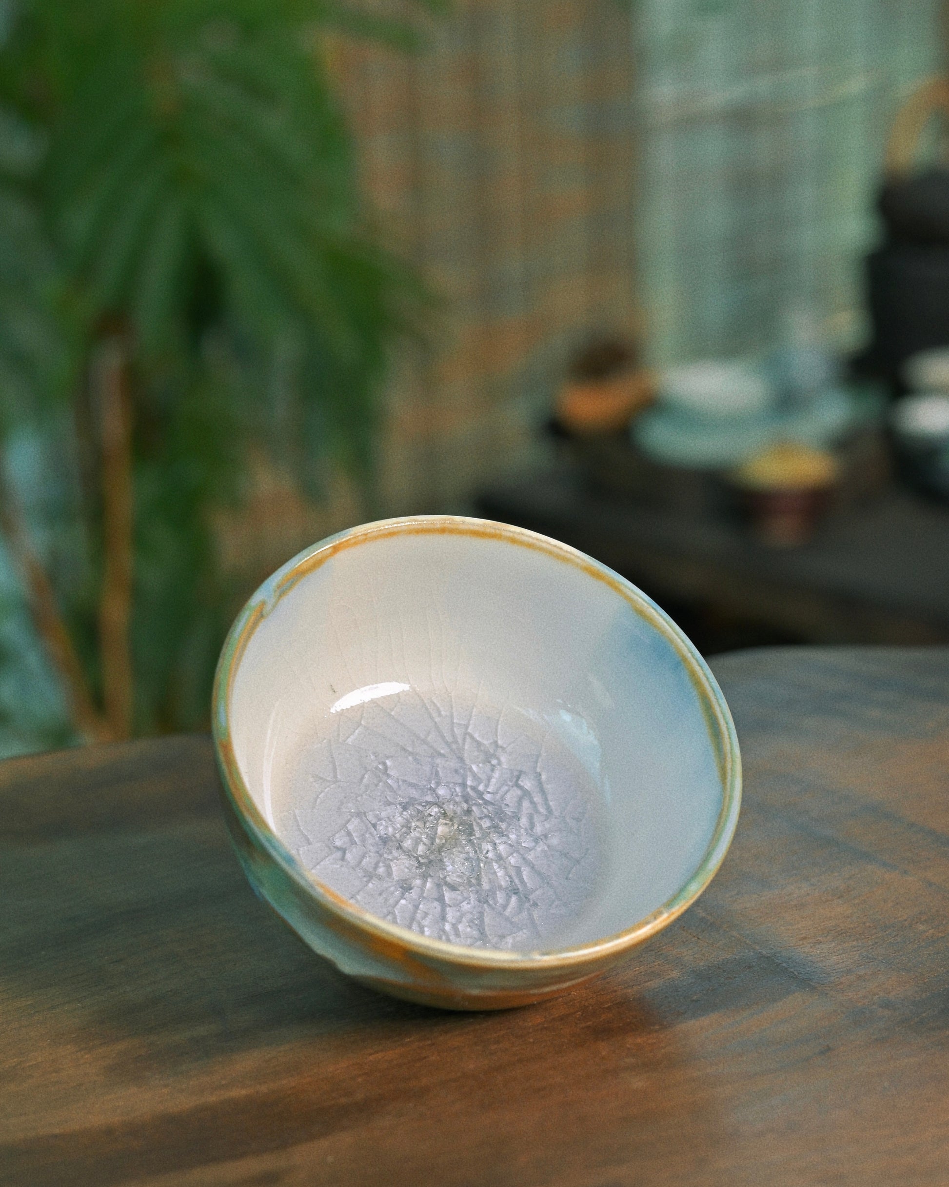 Inside, a subtle crackle pattern unfolds at the base, creating a delicate ice-like texture beneath the smooth glaze. As tea fills the cup, the fine lines gently emerge, adding character and visual poetry to every infusion.
