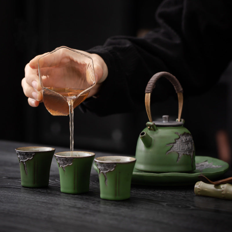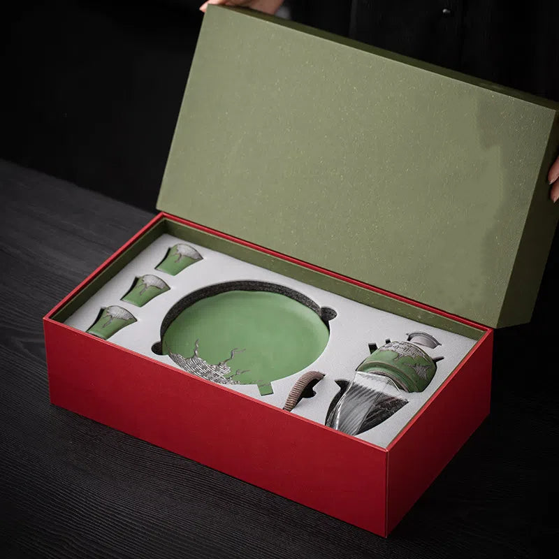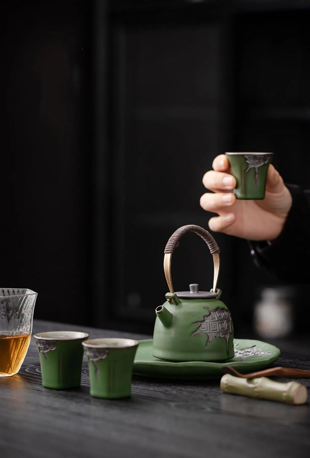 This celadon glaze tea set draws from traditional Chinese ceramic techniques, known for its elegant and timeless qualities. The high-temperature firing process and unique glaze effect are inspired by ancient Chinese pottery, which often celebrated the beauty of natural imperfections and the passage of time. This makes each piece a blend of functional art and cultural heritage.