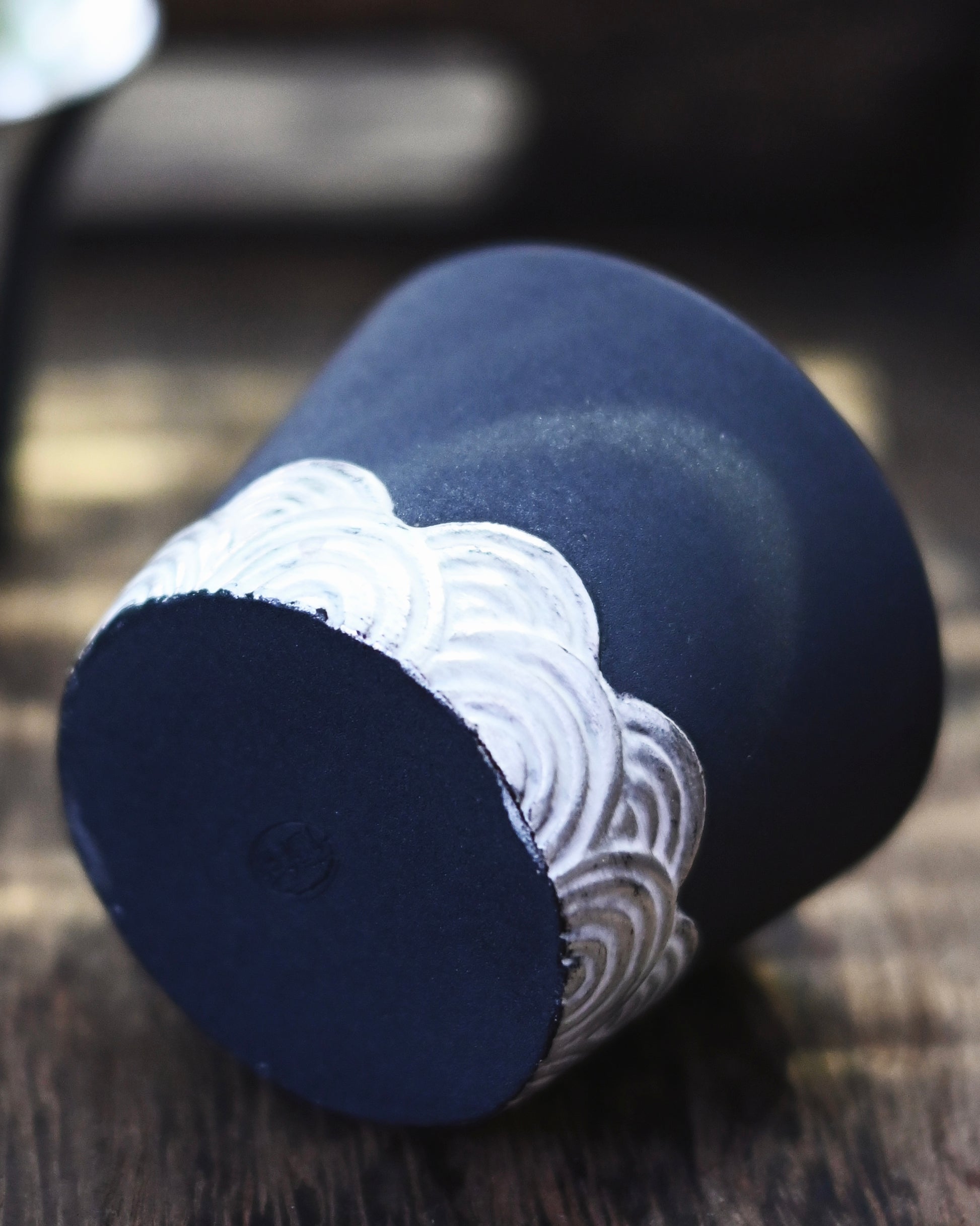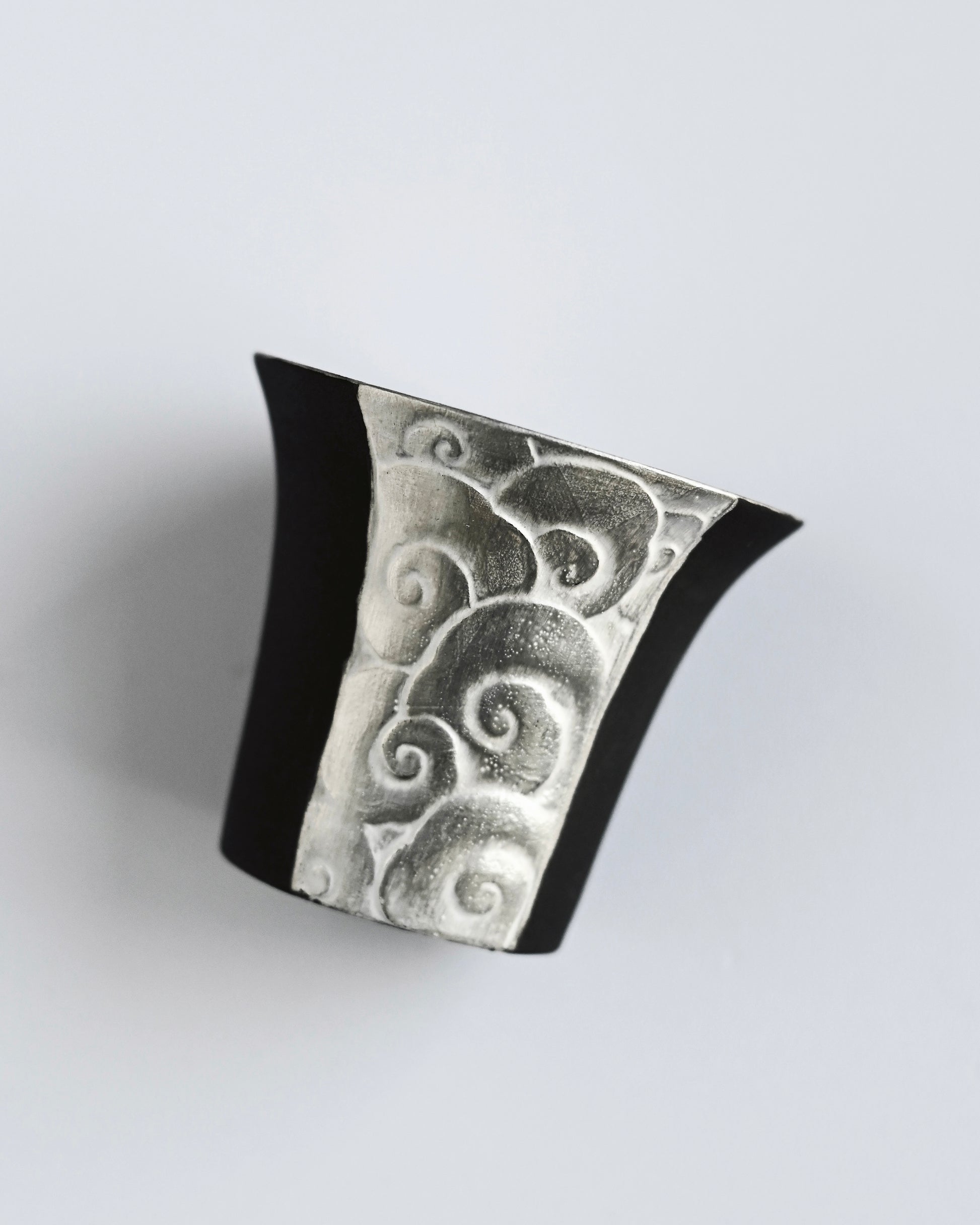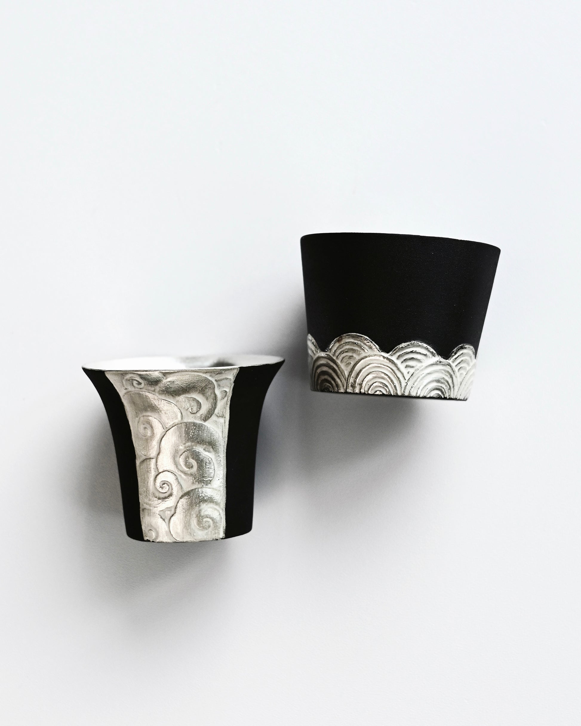 Exterior: Hand-painted waves and auspicious clouds in sterling silver flow across a matte black glaze