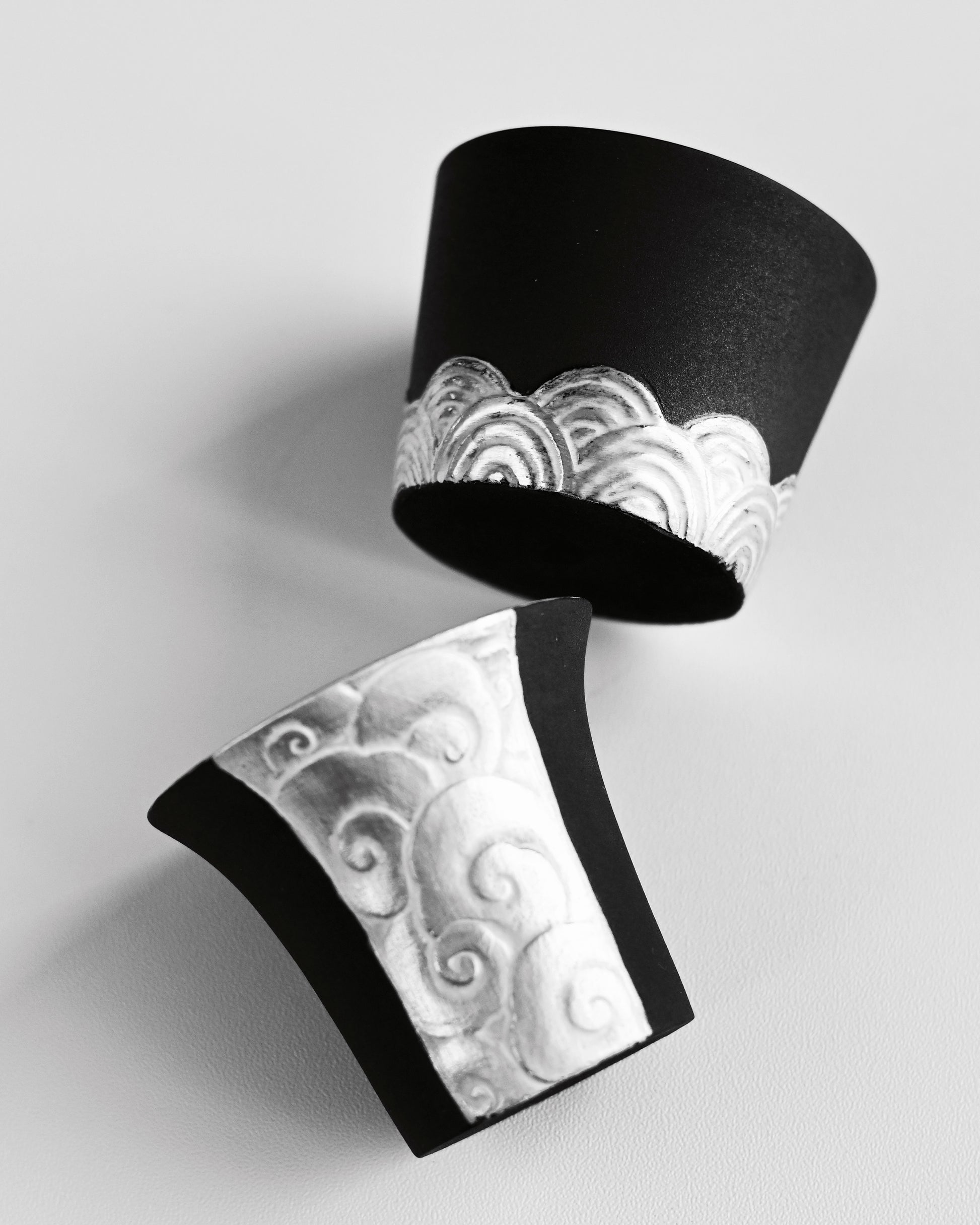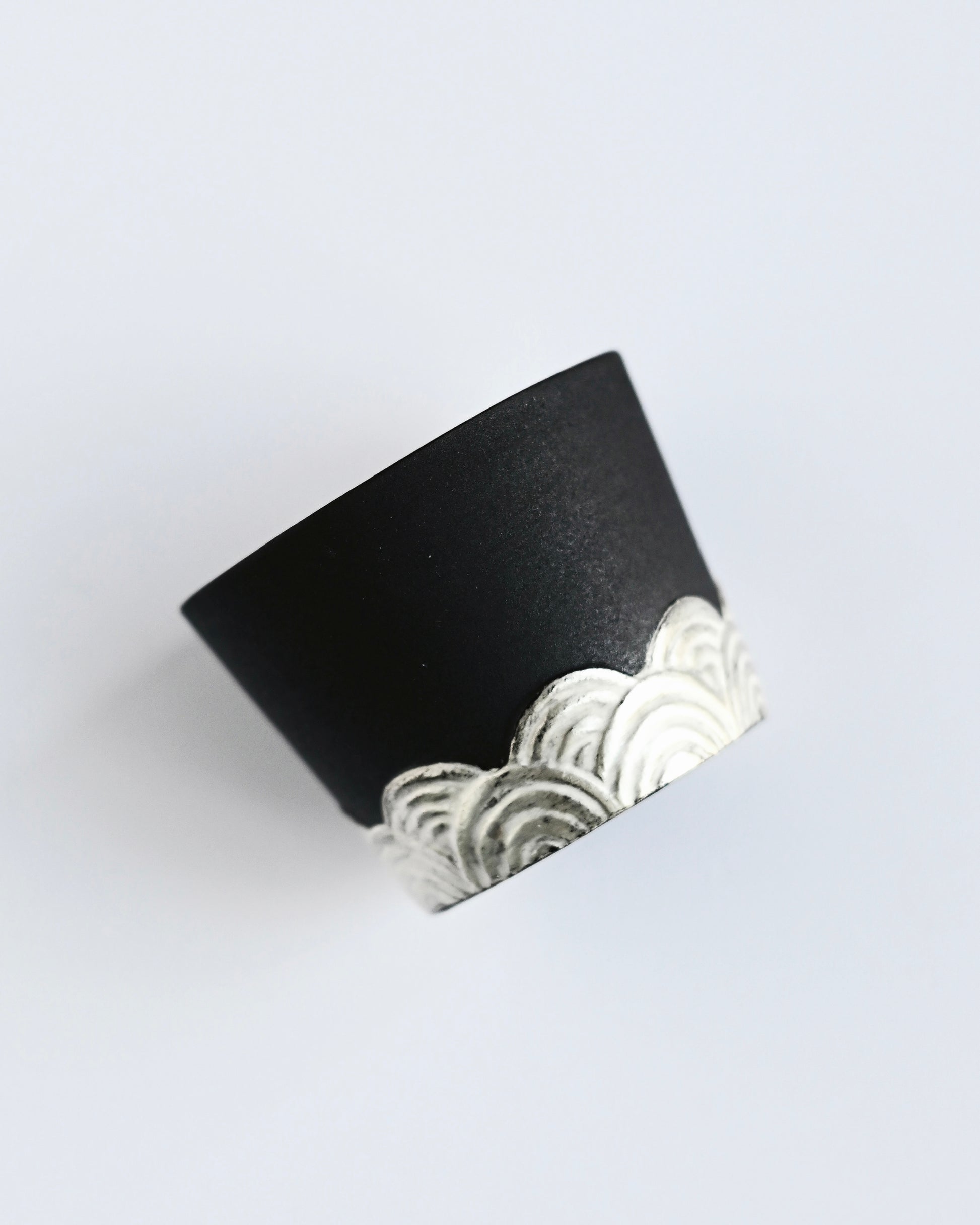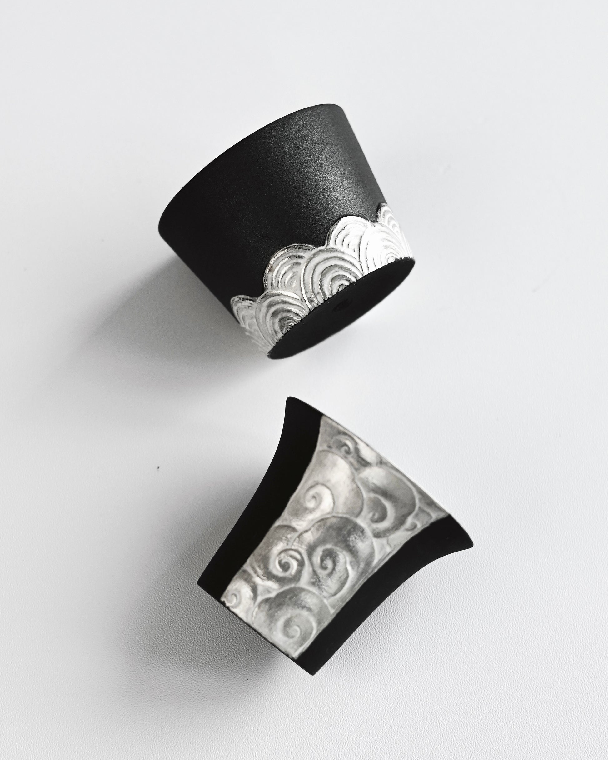 Exterior: Hand-painted waves and auspicious clouds in sterling silver flow across a matte black glaze