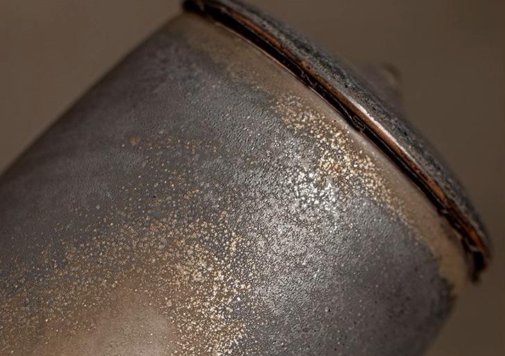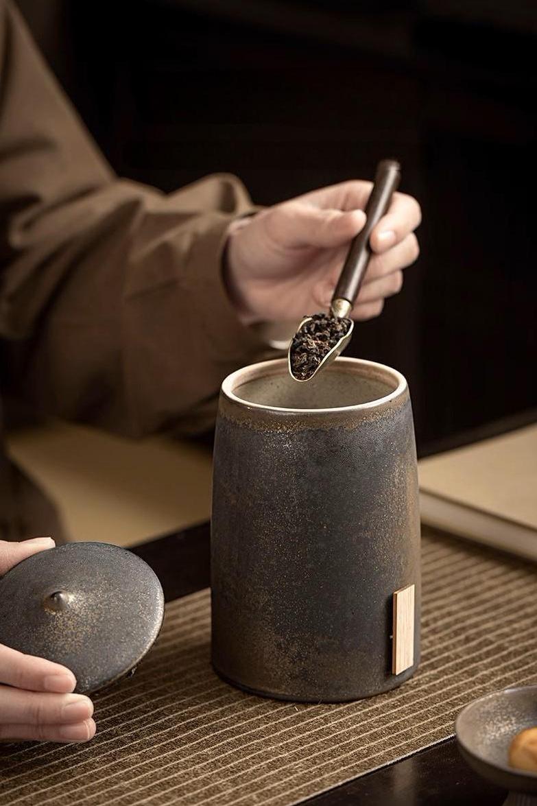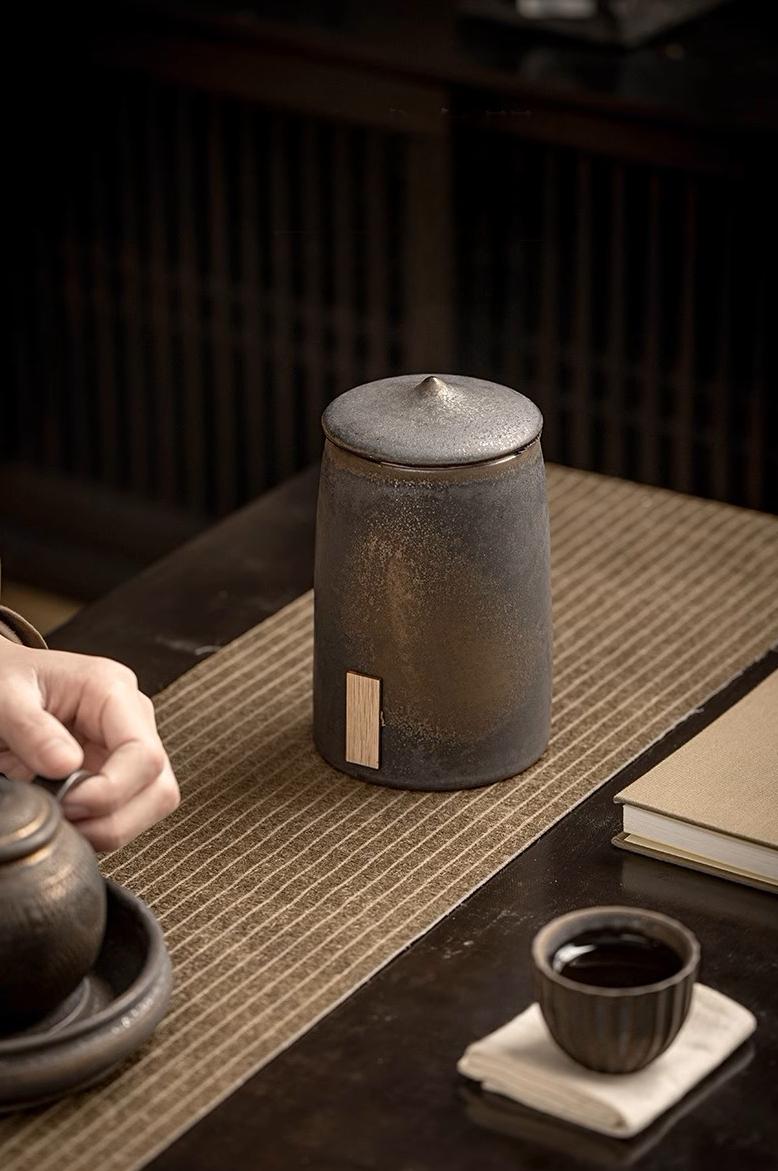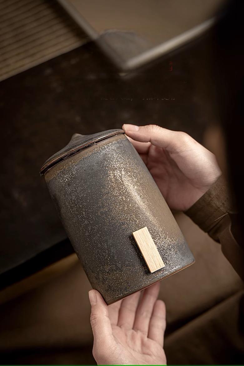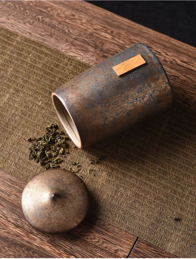 - Bonze glaze ceramic tea canister with a large capacity of 980 ml.