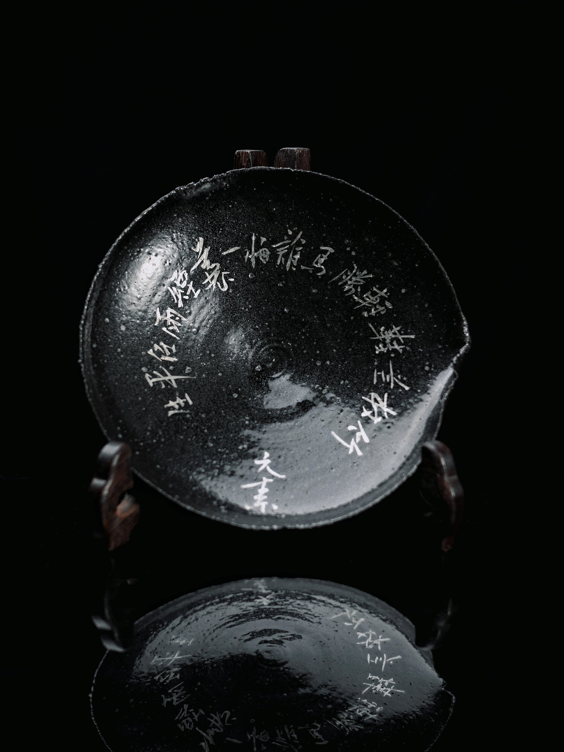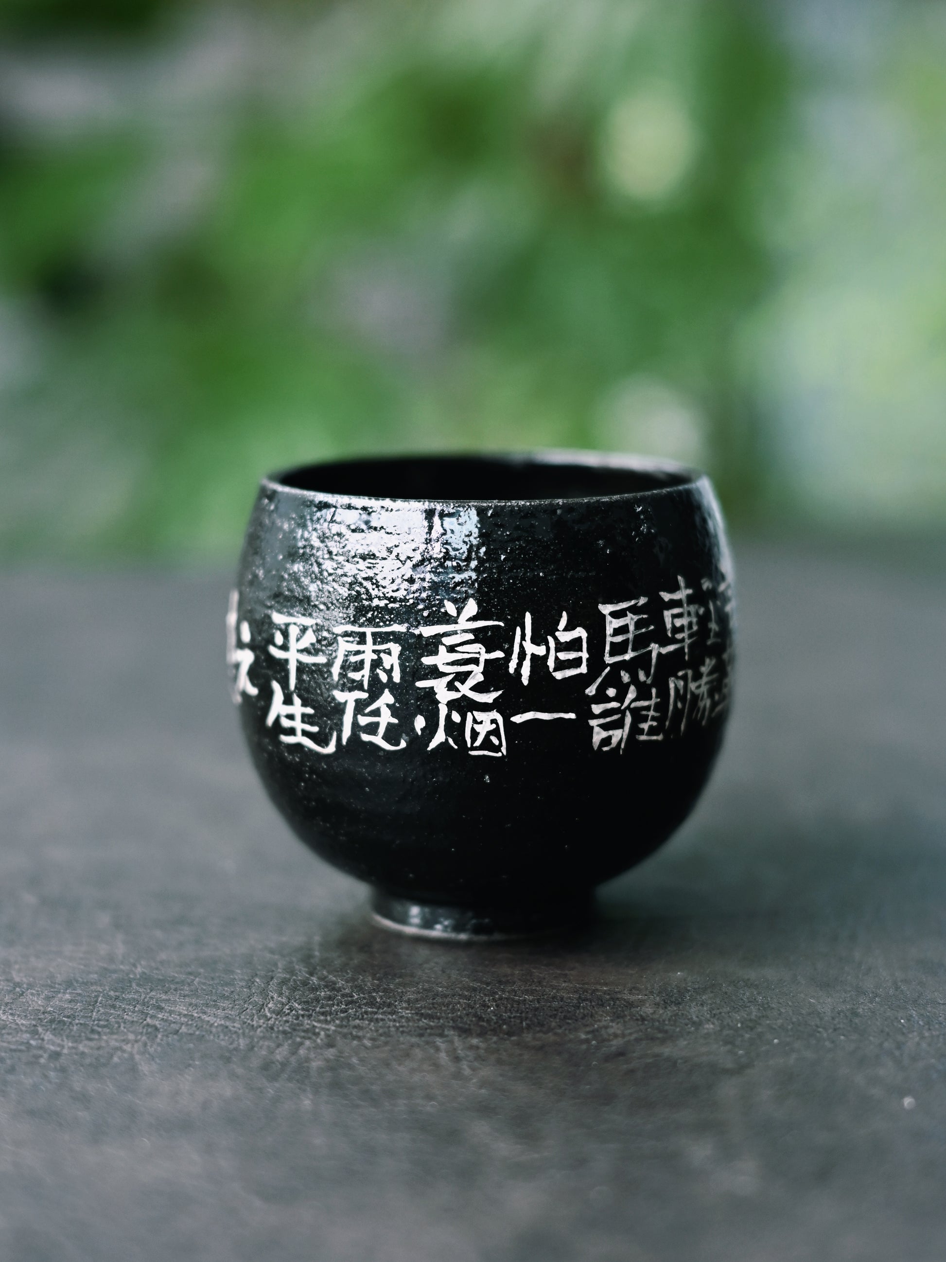 Embrace the profound beauty of imperfection, where rustic poetry meets dark radiance. Handcrafted from coarse clay and adorned with excerpts from Su Shi's "Calming Wind and Waves (Ding Feng Bo)" (定风波), this set transforms tea meditation into a tactile calligraphic experience.