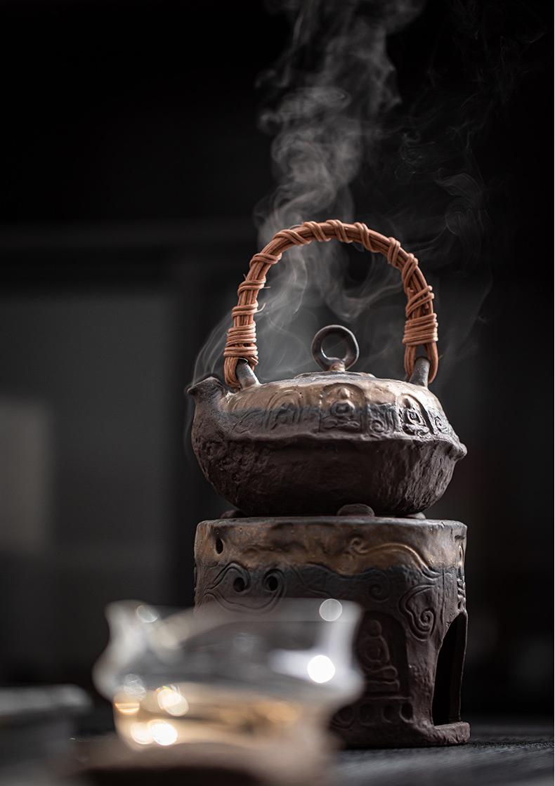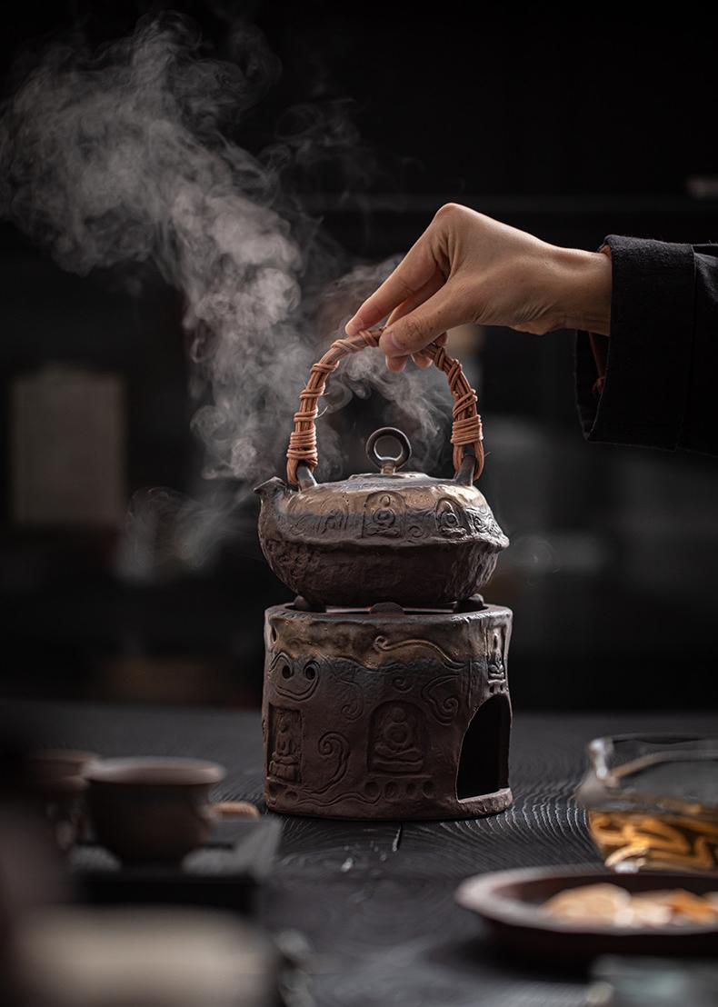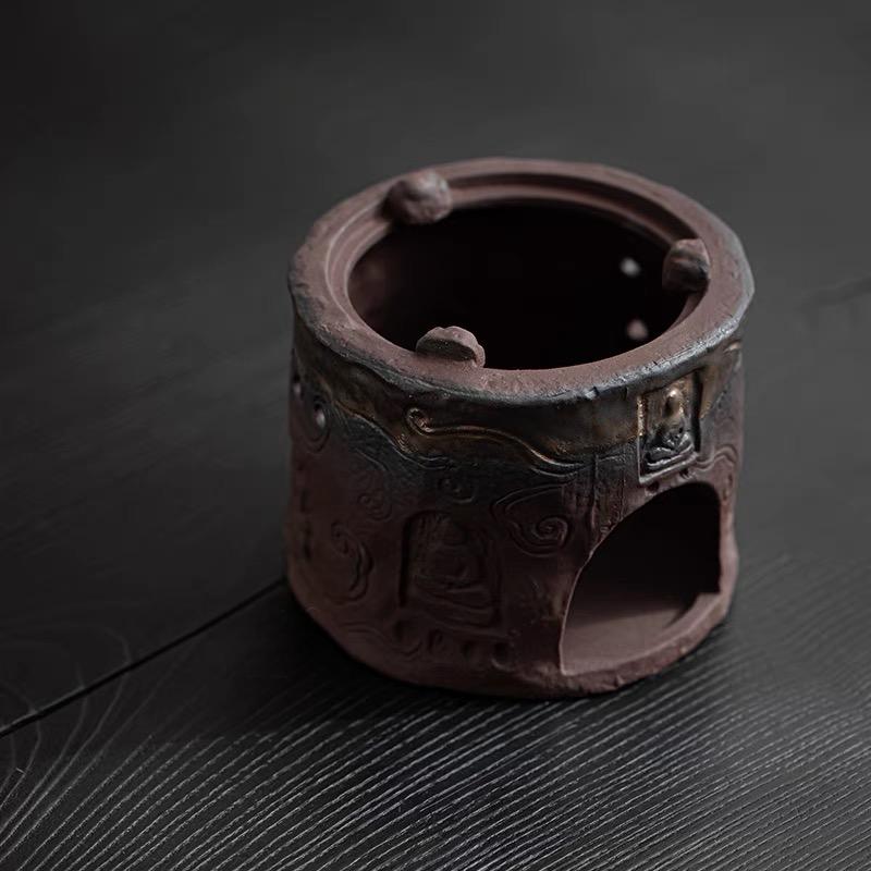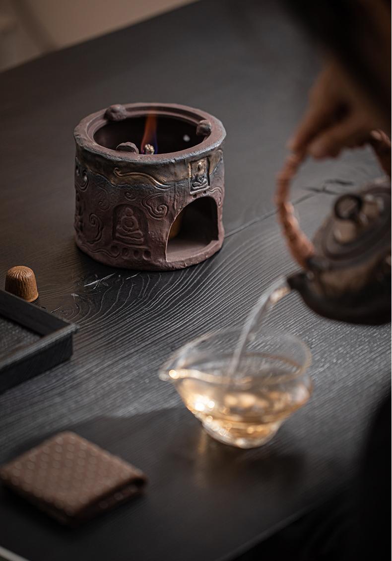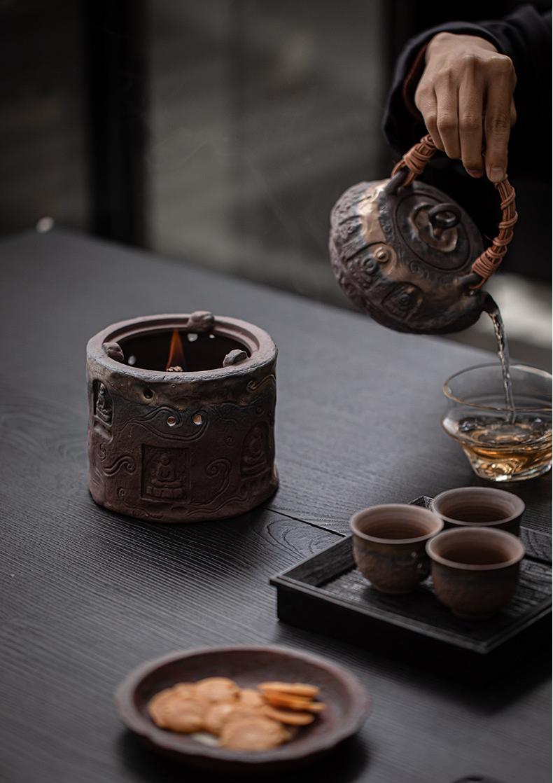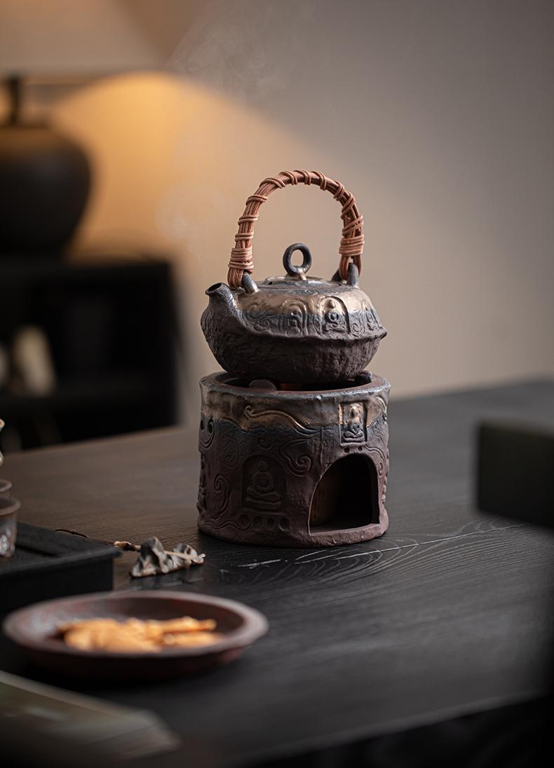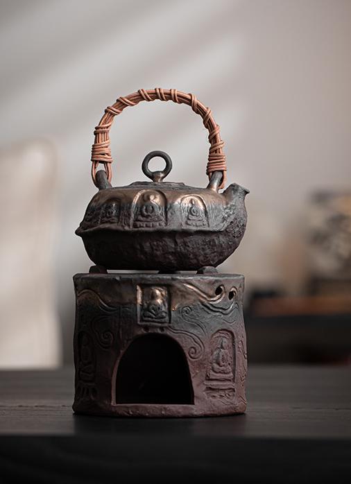 · The matching tea stove and teapot feature molded Buddha figures, showcasing a tranquil Zen aesthetic.