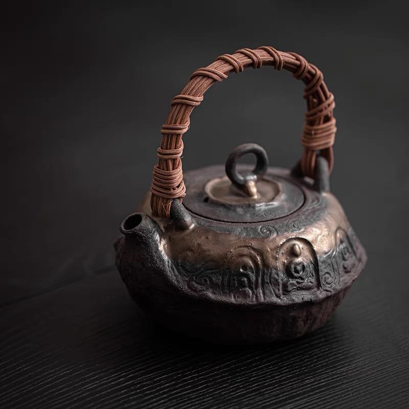 Wabi-sabi Style Rustic Clay Retro Handle Tea Pot and Alcohol Stove