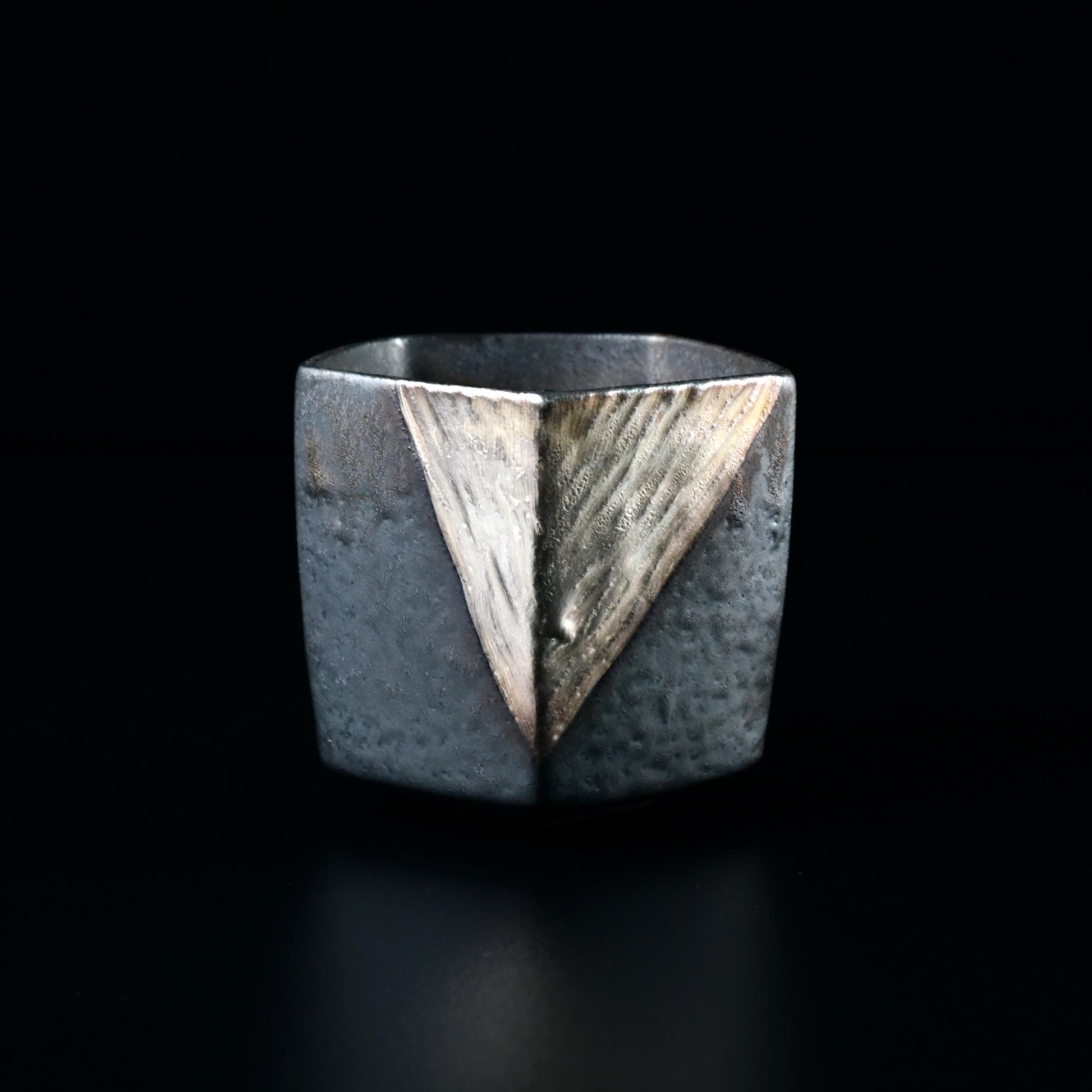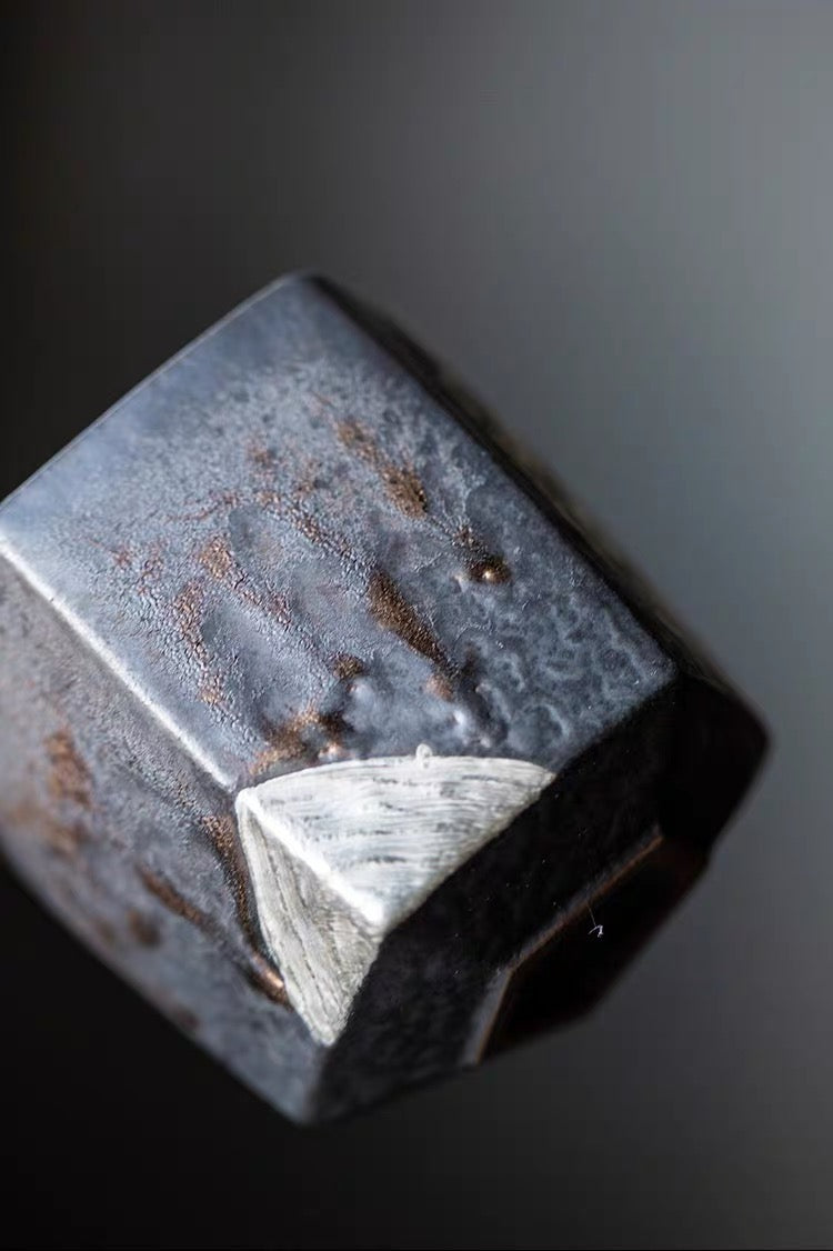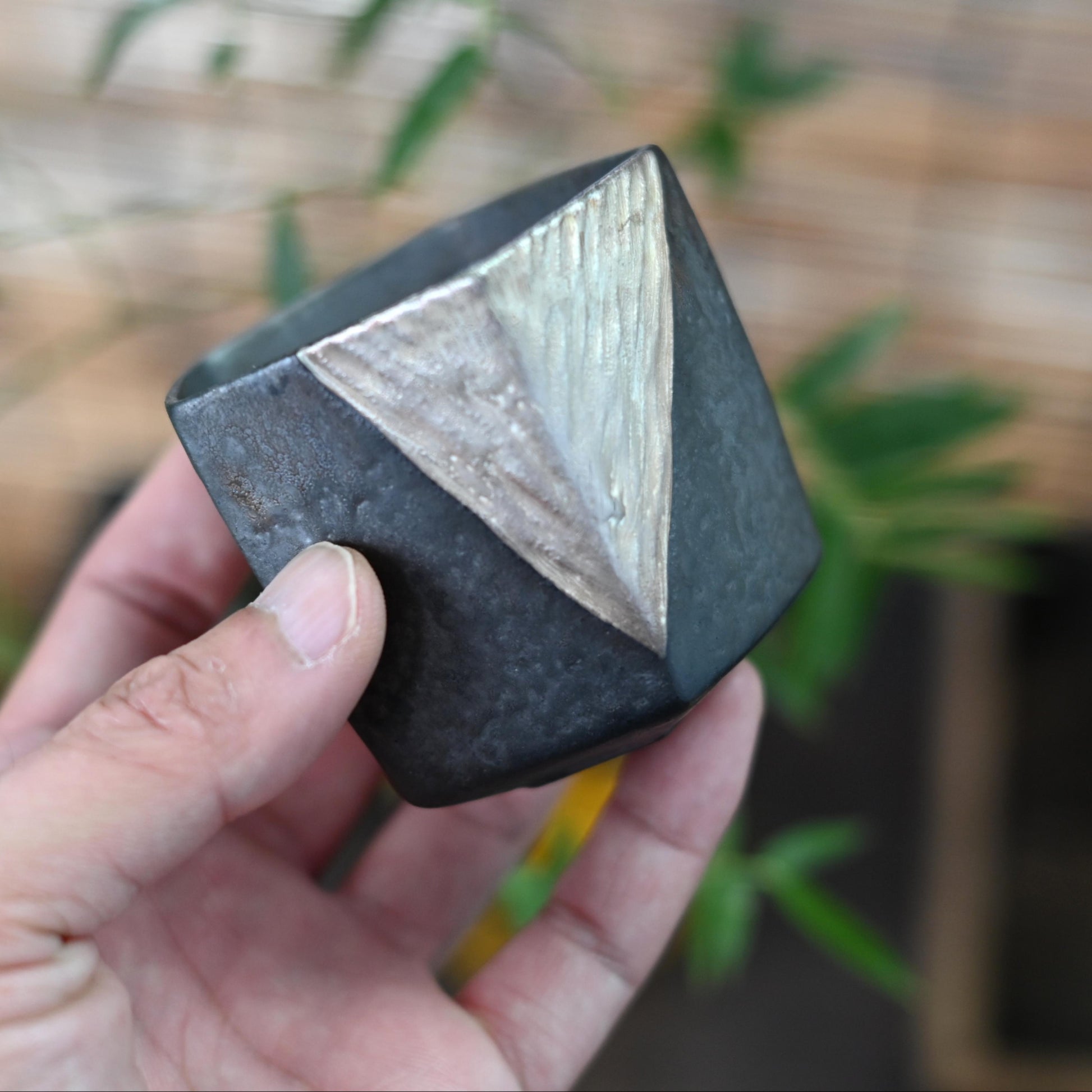 Wabi-sabi Style Rustic Pottery Pentagonal Tea Cup with Triangle Silver-Outlined Patterns