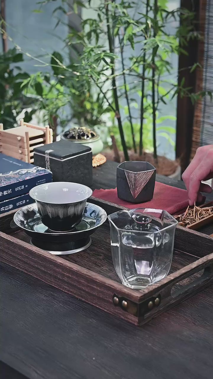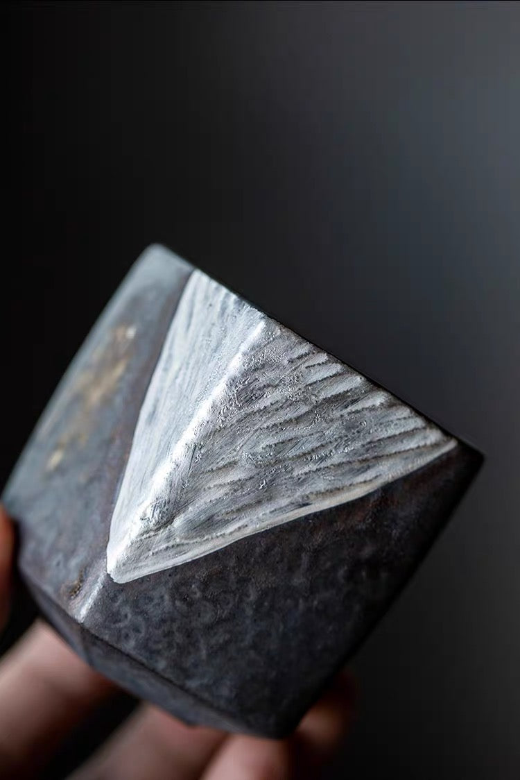 - **Striking Contrast**: The silver geometric triangle patterns on the cup's surface create a striking contrast with the matte pottery, adding a modern touch.