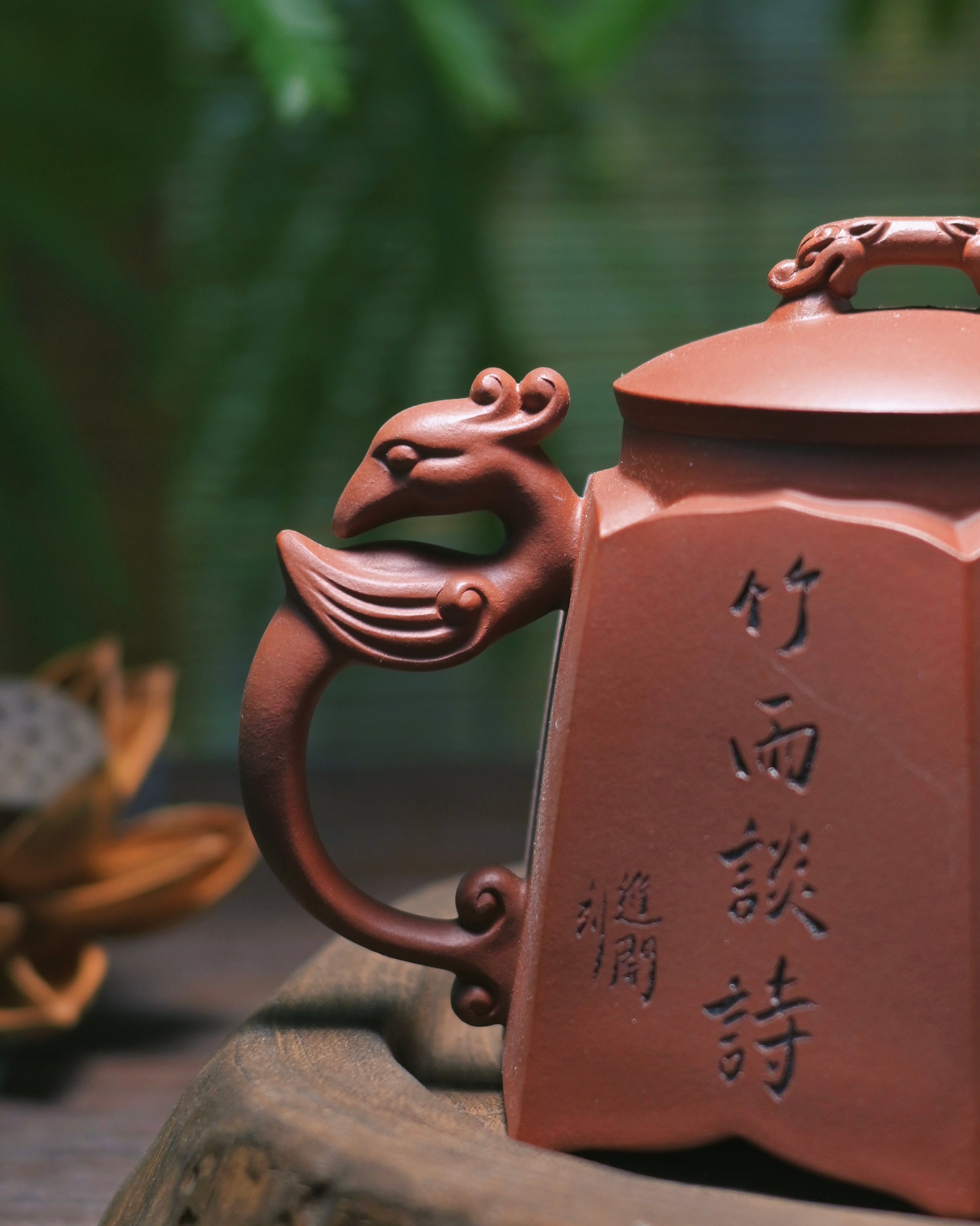 Handcrafted from luminous Yixing Zhuni (vermilion) clay, this hexagonal teapot harmonizes classical literati elegance with sacred symbolism. One side is carved with an ancient pine tree—a symbol of longevity and resilience—while the opposite bears the poetic couplet: Brewing tea with pine wind, discussing poetry in bamboo rain."
